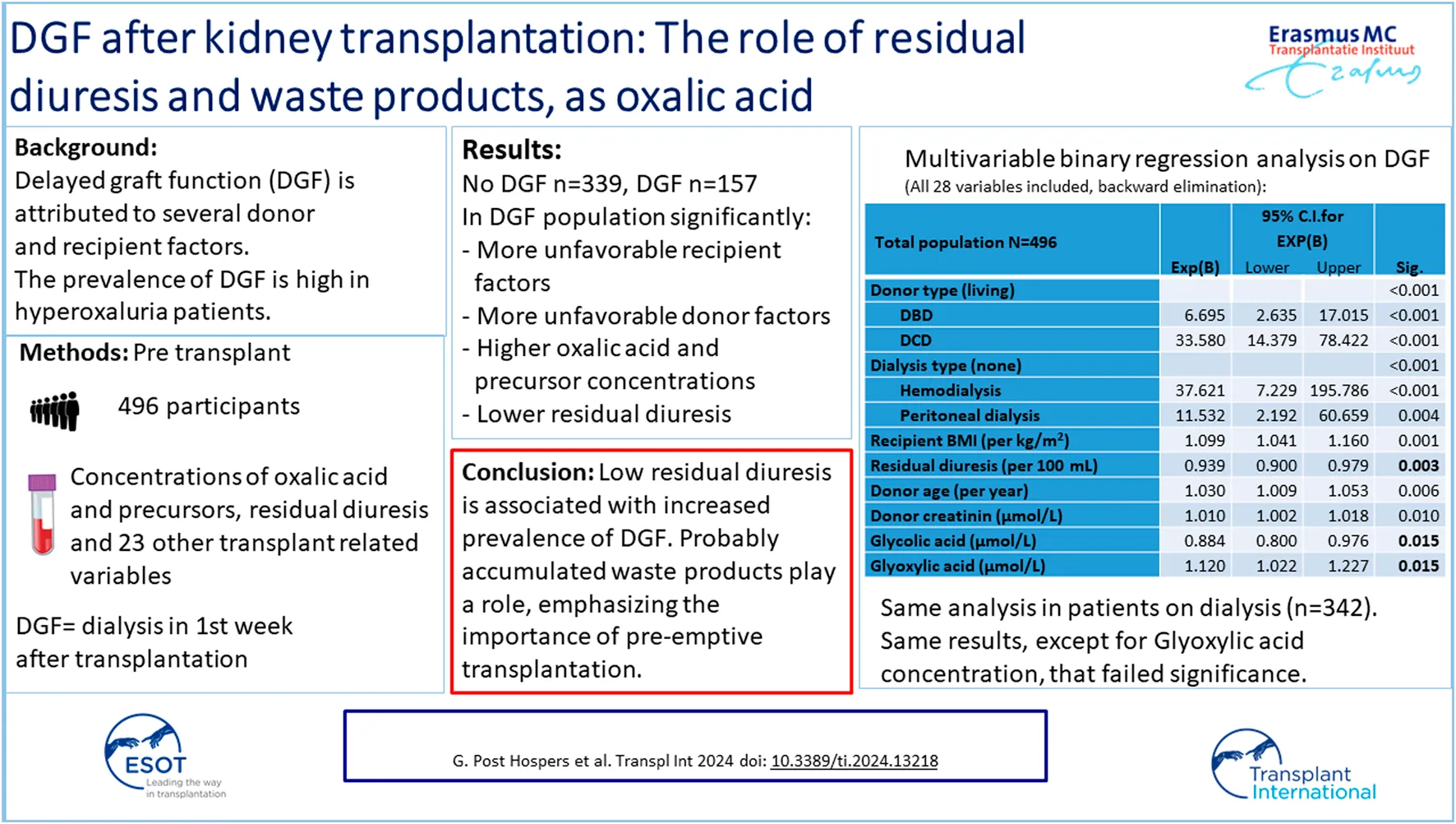Post Hospers G, Visser WJ, Verhoeven JGHP, Laging M, Baart SJ, Mertens zur Borg IRAM, Hesselink DA, de Mik-van Egmond AME, Betjes MGH, van Agteren M, Severs D, van de Wetering J, Zietse R, Vos MJ, Kema IP, Kho MML, Reinders MEJ and Roodnat JI (2024) Delayed Graft Function After Kidney Transplantation: The Role of Residual Diuresis and Waste Products, as Oxalic Acid and Its Precursors. Transpl Int 37:13218. doi: 10.3389/ti.2024.13218