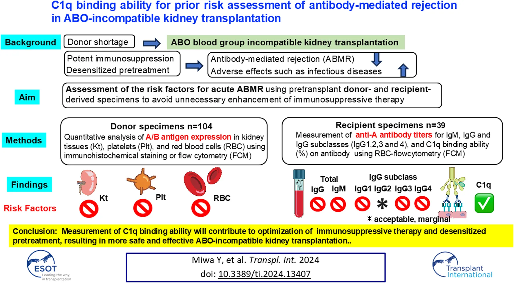Miwa Y, Iwasaki K, Murotani K, Okada M, Nagasaka T, Watarai Y, Takeda A, Shizuku M, Ashimine S, Ishiyama K, Maruyama S and Kobayashi T (2024) C1q Binding Ability for Prior Risk Assessment of Acute Antibody-Mediated Rejection in ABO-Incompatible Kidney Transplantation. Transpl Int 37:13407. doi: 10.3389/ti.2024.13407