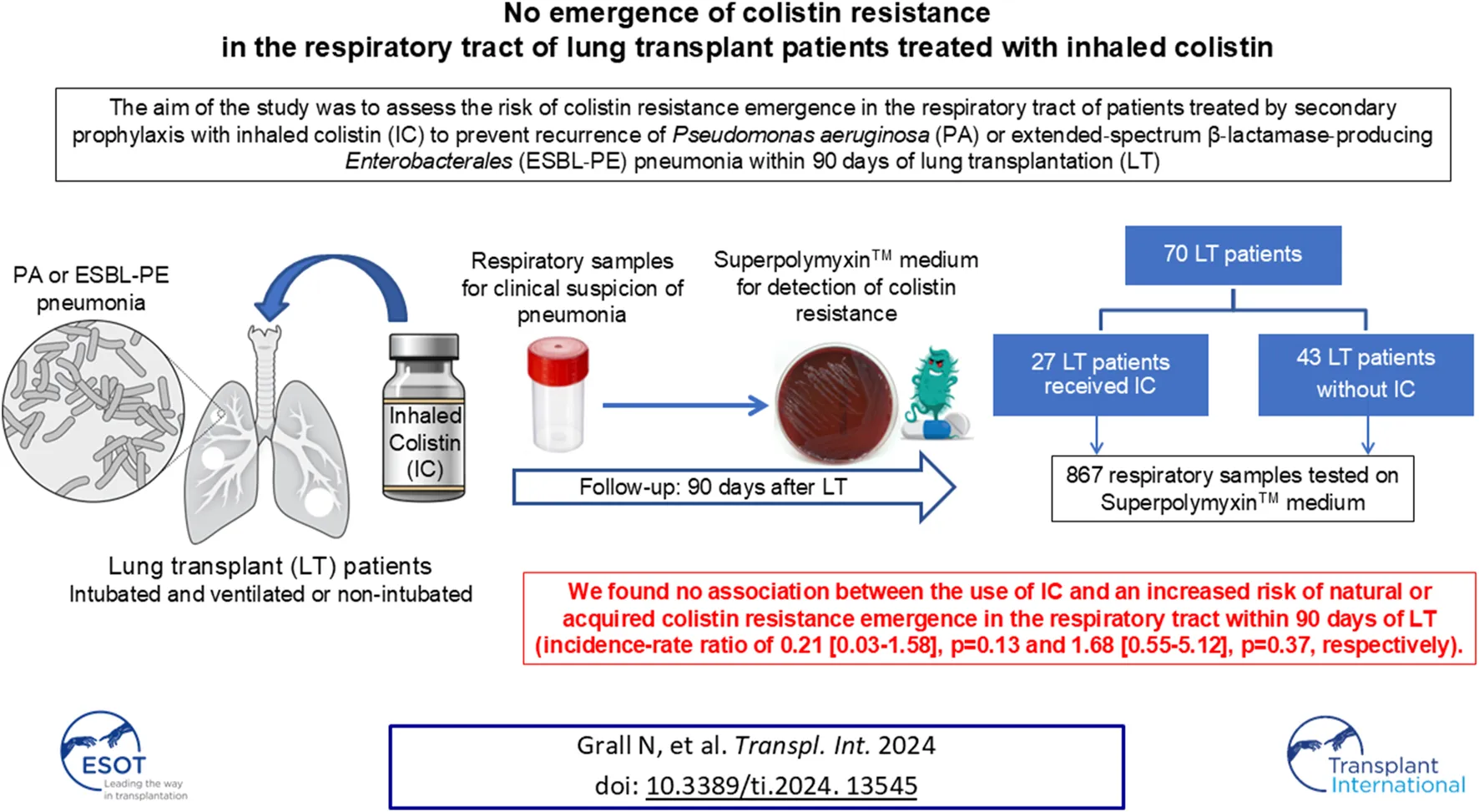 Grall N, Assadi M, Esposito-Farese M, Lortat-Jacob B, Tanaka S, Atchade E, Messika J, Bunel V, Mal H, Mordant P, Castier Y, Garnier B, Gueye S, Petitjean M, Denamur E, Armand-Lefevre L, Burdet C, Montravers P and Tran-Dinh A (2025) No Emergence of Colistin Resistance in the Respiratory Tract of Lung Transplant Patients Treated With Inhaled Colistin. Transpl Int 37:13545. doi: 10.3389/ti.2024.13545