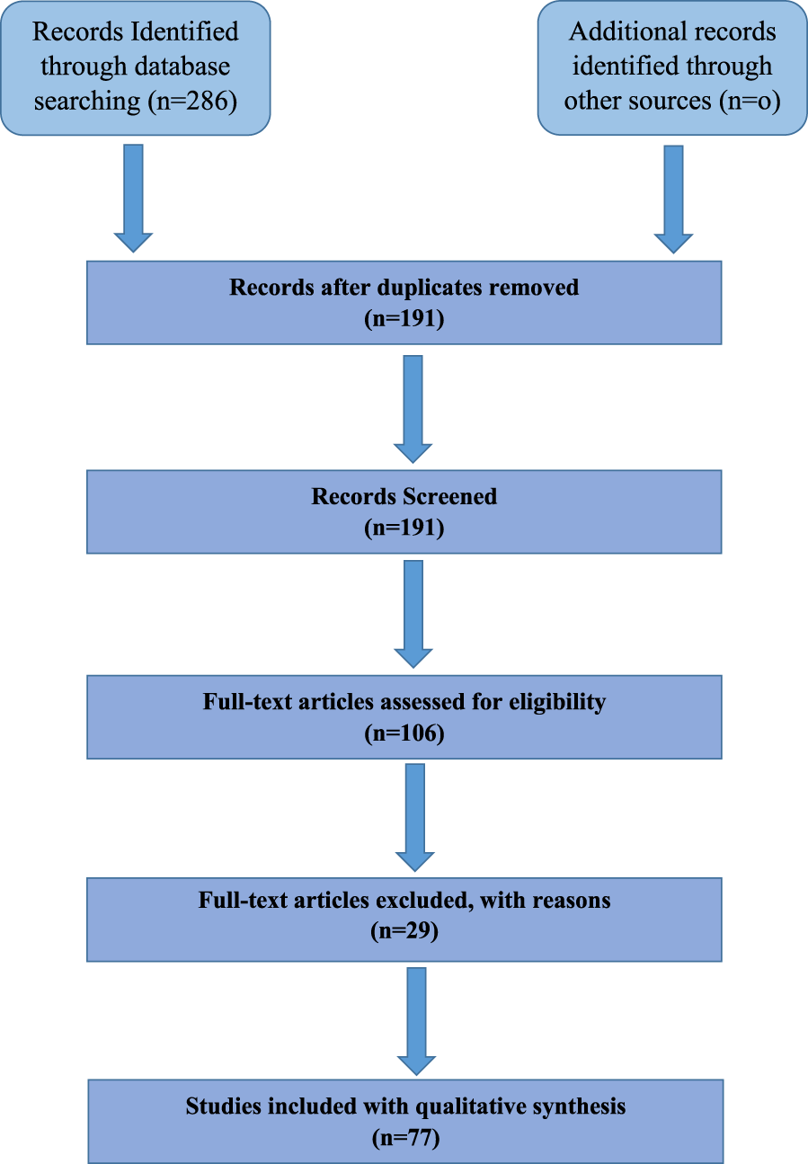 PRISMA flow diagram outlining the study selection process for this systematic review. A total of 286 records were initially identified through database searches (PubMed, Scopus, Science Direct). After removing 95 duplicates, 191 records remained for title and abstract screening. Of these, 106 full-text articles were assessed for eligibility, with 24 being unavailable and 85 excluded for irrelevance or lack of sufficient data. Finally, 77 studies were included in the qualitative synthesis.