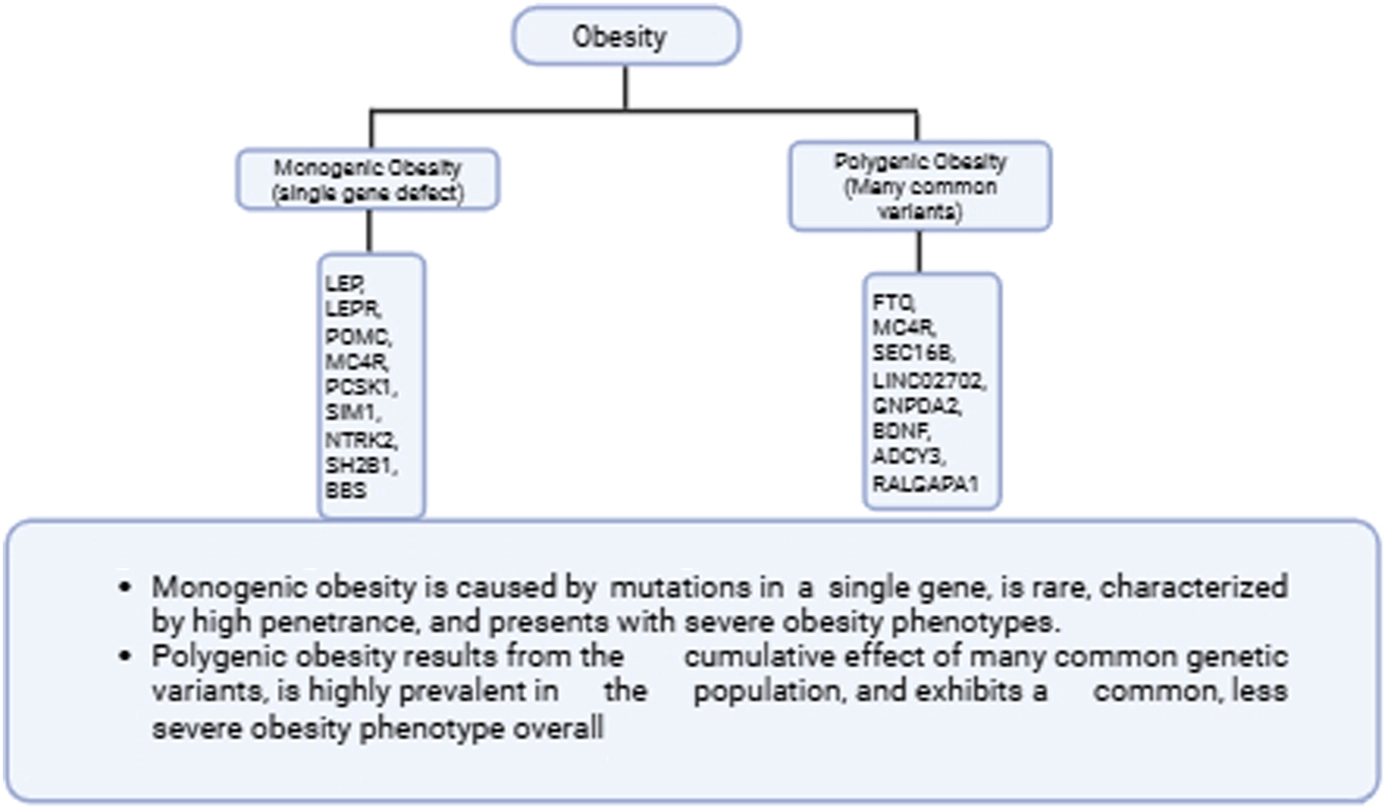 Following established traditional protocols, Loos and Yeo (2022) divided obesity into two categories. First, there is monogenic obesity, which is based on Mendelian rules associated with a severe disease course and states that underlying mechanisms of obesity would include deletions in the chromosome or the deletion of a single gene Second, there is polygenic obesity, also known as common obesity, which is associated with hundreds of polymorphisms (Loos and Yeo, 2022).