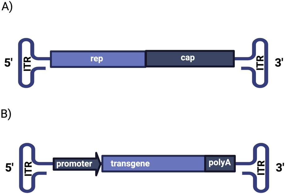 Schematic representation of (A) wild-type and (B) recombinant AAV genome structure. The genome of wild-type AAV contains the rep (replication) and cap (capsid) genes flanked by inverted terminal repeats (ITRs). Recombinant AAV vectors are constructed by replacing rep and cap with a transgene of interest under the control of specific promoter and polyadenylation signal.