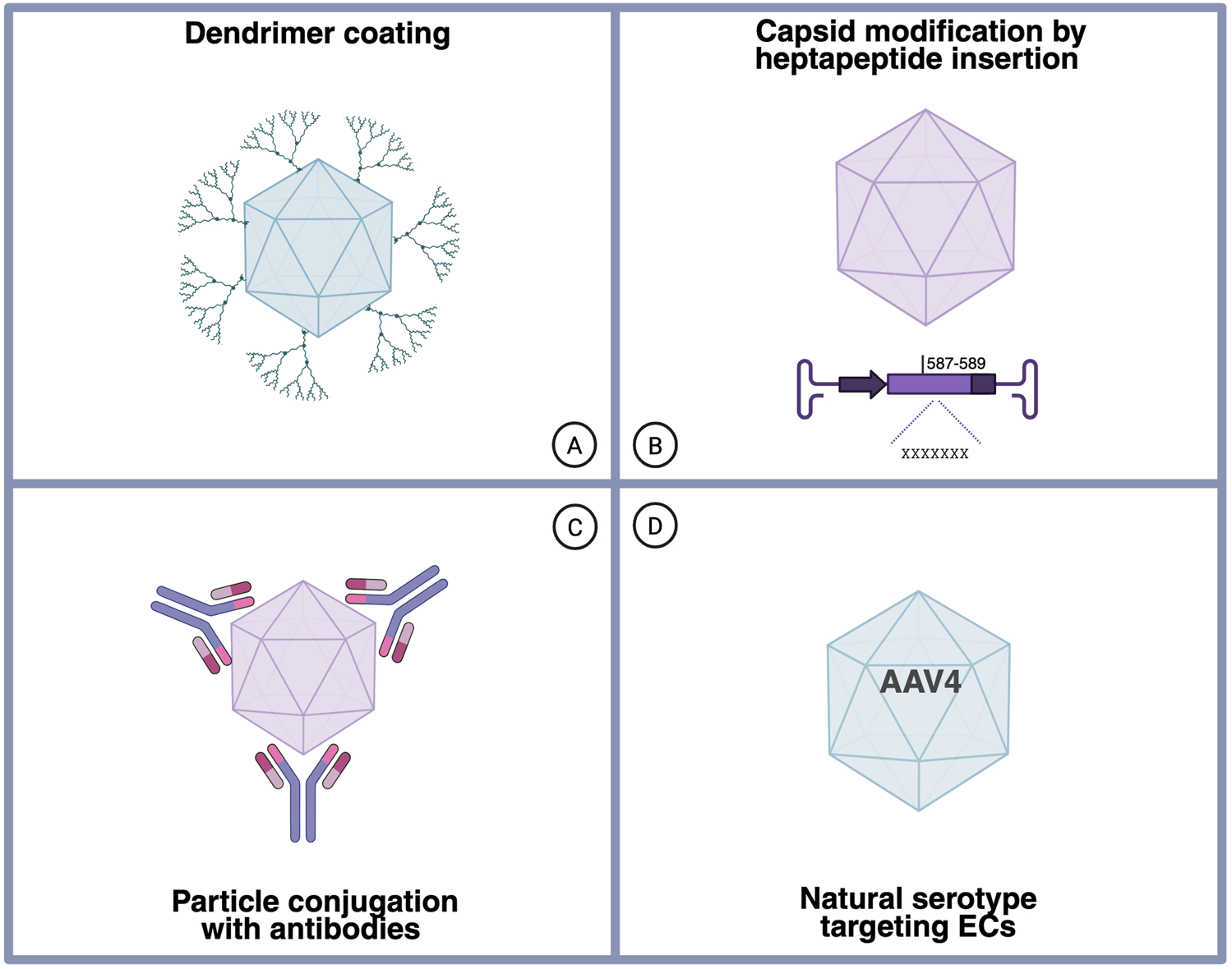 Strategies to enhance endothelial tropism of AAV vectors. (A) Surface coating of AAV particles with endothelial-affine polymers. (B) Genetic capsid engineering by the insertion of endothelial-targeting peptides into the exposed loop around amino acid position 587–589 of the VP3 protein in AAV genome. (C) Chemical conjugation of the viral capsid with antibodies specific for endothelial cell surface markers. (D) The use of naturally occurring AAV serotypes with innate endothelial preference, particularly AAV4.