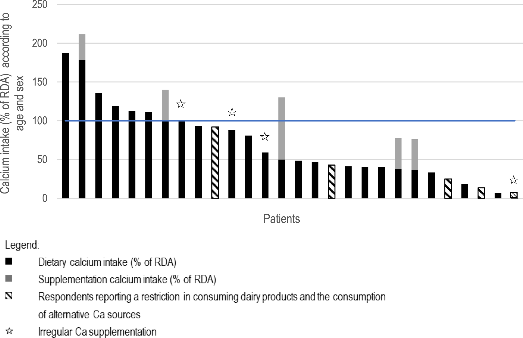Individual Ca intake presented as percentage of Recommended Dietary Allowance depending on age and sex (RDA, blue line) from diet and supplementation according to the results of the ADOS-Ca questionnaire.