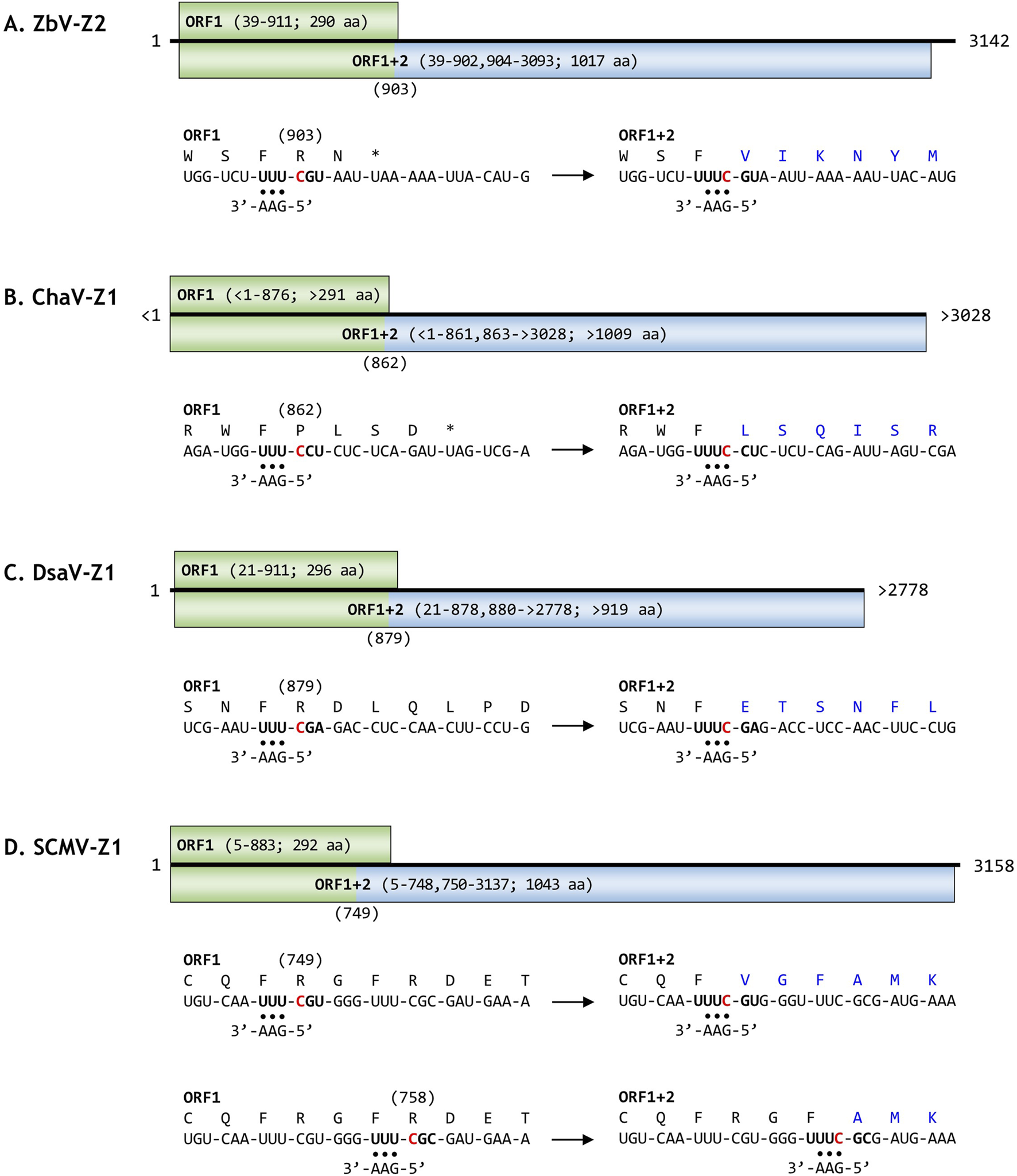 Genomic organization of newly identified viral contigs and proposed +1 programmed ribosomal frameshifting (PRF) sites. The genomic organization of the newly identified viral genomes ZbV-Z2 (A), ChaV-Z1 (B), DsaV-Z1 (C), and SCMV-Z1 (D) is shown, including open reading frames (ORFs) encoding ORF1p and the ORF1+2p fusion protein. Nucleotide positions and amino acid lengths for each ORF are indicated in parentheses. Putative +1 PRF sites and associated tRNA slippage mechanisms are illustrated below each genome panel. Amino acids translated from the ORF2 reading frame, following frameshifting, are highlighted in blue. Note that ChaV-Z1 ORF1 and ORF2 lack portions of the N-terminal and C-terminal amino acid residues, respectively, and DsaV-Z1 ORF2 lacks a portion of its C-terminal region.