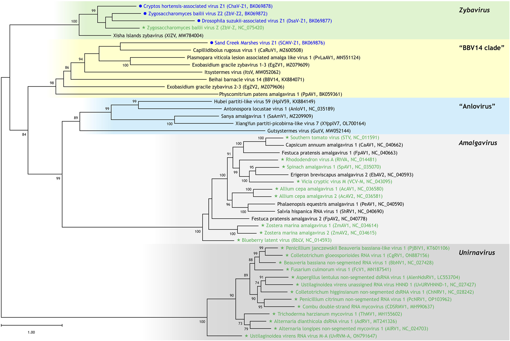 The remaining viruses formed two well-supported clades corresponding to the genera Amalgavirus and Unirnavirus, each with a bootstrap support value of 100. These results are consistent with their current taxonomic classification.