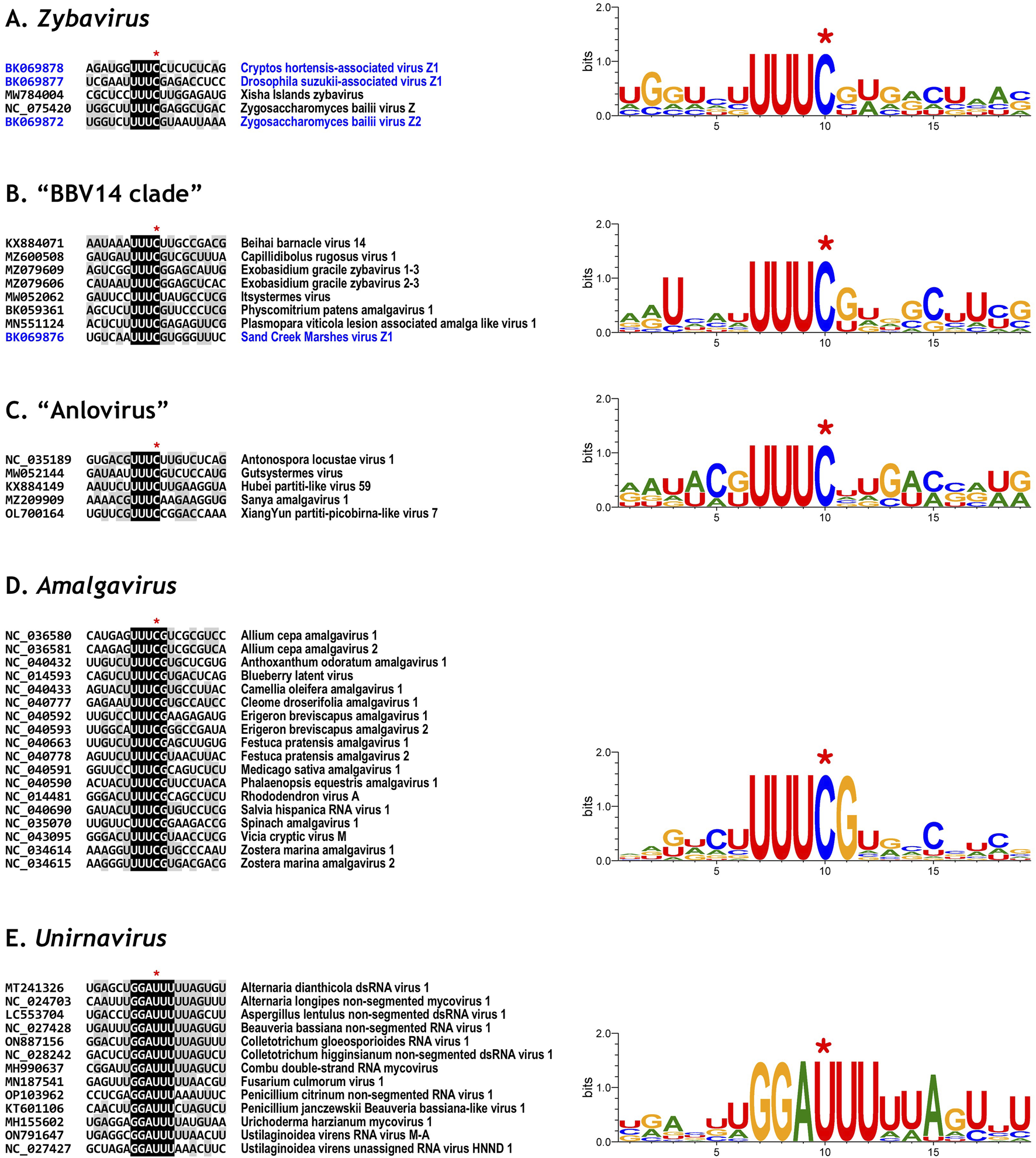 Analysis and comparison of programmed ribosomal frameshifting (PRF) sites among members of the family Amalgaviridae. Alignments of PRF site sequences are shown for the genus Zybavirus(A), the “BBV14 clade” (B), the proposed genus “Anlovirus” (C), the genus Amalgavirus(D), and the genus Unirnavirus(E). Residues identical across all sequences are highlighted with a black background, and those conserved in at least half of the sequences are shown with a gray background. Sequence logos illustrating conservation patterns, derived from the aligned sequences, are shown on the right. A red asterisk marks the C residue skipped during +1 PRF translation (A–D) or the U residue translated twice during −1 PRF translation (E).