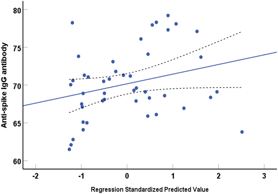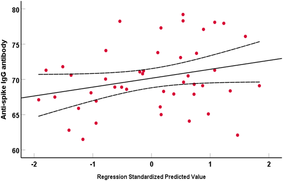 Table 1 shows the effect of two doses of Pfizer-BNT162b mRNA on the profile of complete blood count and the hematological ratios derived from these counts. There were no significant differences in the levels of HB, while the volume and diameter of red cells were significantly decreased by 2.1% and 4.8%, respectively. Red cell variables related to hemoglobin, including Hct, MCH, and MCHC, increased dramatically as the red cell count increased. The total leukocyte count is significantly decreased, while the percentage of granulocytes is significantly increased by 13.7%. There were no significant changes in the percentages of lymphocyte and monocyte values. The alterations in the blood platelet indices included non-significant changes in the blood platelet count, a significant increase in the PDW and MPV, and a significant reduction in the PCT. Hematological ratios derived from the blood profile are characterized by a significant increase of GLR and PLR by 11.4% and 22.2%, respectively, while a minor reduction in the LMR (2.7%) was observed. The PHR value, as a worse prognostic marker, was non-significantly increased. Table 2 shows that the significant increase in the anti-spike IgG is associated with a significant increase in the ferritin, tumor necrosis factor alpha, and CD 256 APRIL values. The inflammatory indices derived from granulocyte, monocyte, lymphocyte, and platelet counts represented by SIRI and AIRI, were non-significantly suppressed. Bivariate (Spearman’s) correlations showed a significant relationship between platelet count and PLR (r = 0.53, p < 0.001), PHR (r = 0.935, P < 0.001), and AIRI (r = 0.346, p = 0.020) (Table 3). PLR is significantly and positively correlated with SIRI (r = 0.408, p = 0.005), and AIRI (r = 0.582, p = <0.001). Similarly, the LMR is also significantly and positively correlated with SIRI, AIRI, and CD256 APRIL (Table 3). The intercorrelations between these variables are not impacted by the sample size, as shown in Table 4. Interestingly, the PHR value is correlated substantially with AIRI but not with SIRI. The changes in the inflammatory indices represented by SIRI and AIRI are not predictors for the levels of anti-spike IgG antibodies, as a marker of immune response to the vaccination, as shown by a multivariate linear regression analysis (Figure 1). Figure 2 shows that the PLR, LMR, and PHR are non-significant predictors of immune response evoked by vaccination.