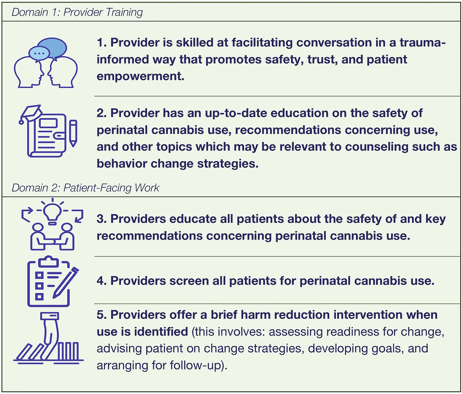 The first of these domains is provider training. Core components that fall into this domain are related to competencies that a provider should achieve (through training and mentorship) outside the context of, and ideally before arriving at, the clinical encounter. The first core component within this domain is that the provider is skilled at facilitating conversation. This means they understand how to be trauma-informed in a patient conversation (empower patients to make informed decisions, practice reflexivity, and incorporate an awareness of power differentials into their process of asking the patient questions). The second core component within this domain is provider education about cannabis use. This means providers have an up-to-date knowledge of the safety data and recommendations regarding cannabis use during pregnancy and breast-feeding. They should also possess a basic understanding of cannabis including knowledge of topics such as cannabinoids, modes of consumption, and behavior change strategies to reduce harm stemming from use.