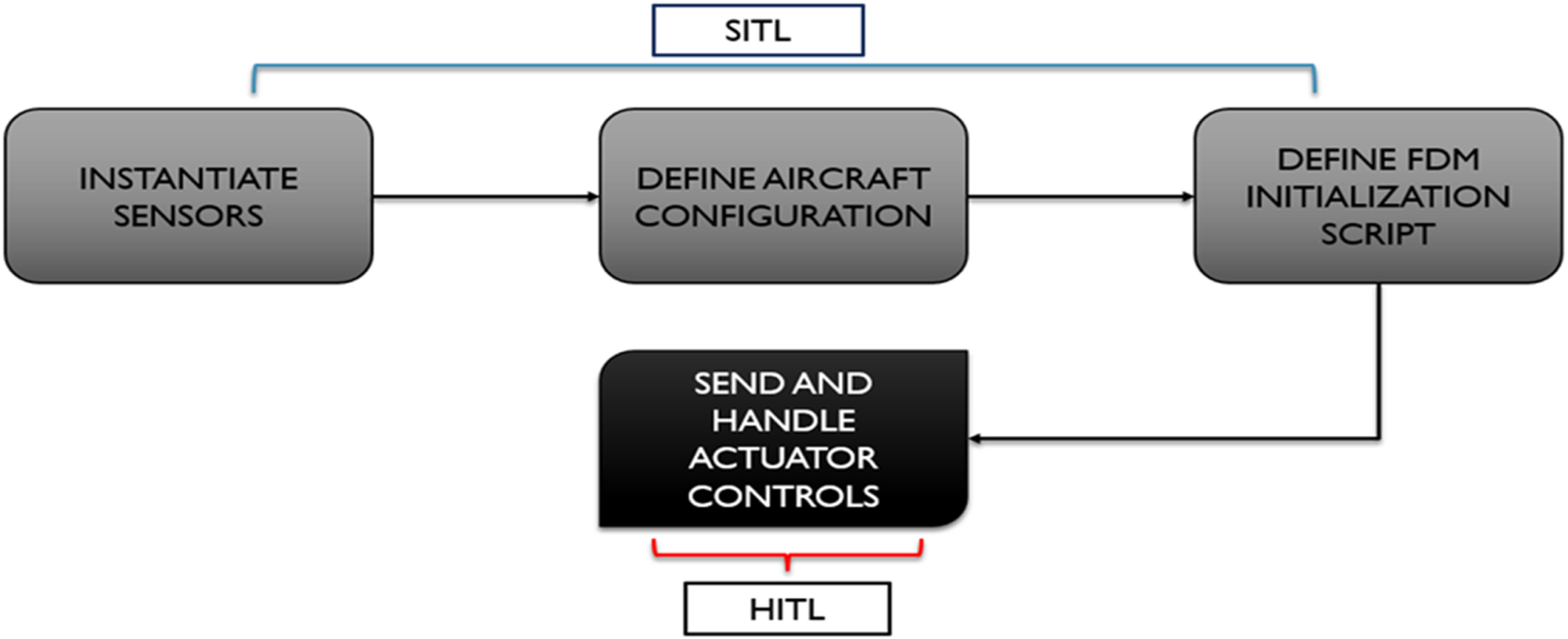 JSBSim is an open-source FDM that can be modified to include custom dynamic parameters such as moments, inertia, accelerations and position, which are then processed by nonlinear aircraft equations of motion. A minimalist, lightweight version of JSBSim was built by reducing certain features, such as propulsion models, complex aerodynamics, and unnecessary aircraft components (e.g., hydraulics and pneumatics), to reduce the computational load. JSBSim is also capable of generating dynamic link libraries, also known as shared libraries, which can be loaded and linked at runtime by the program “Bridge_executable”. This library contains the compiled JSBSim code used by the application to enable realistic flight simulation. By linking the shared library, the application also gains access to a set of header files in which JSBSim functions and classes are contained. FGFDMExec.h (Flight Dynamics Model Executive) is an important header to include in the project for accessing the “FGFDMExec” class, which manages and is responsible for coordinating various components in the simulation, including aircraft systems, setting component paths, control inputs, and more. The schematic in Figure 2 shows the SITL to HITL interconnection for JSBSim.