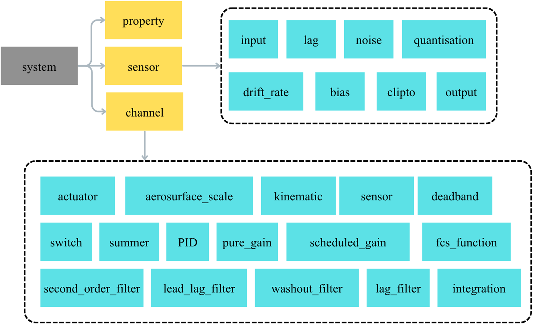 The XML format for defining sensors and actuators represents a configuration file designed for creating JSBSim property nodes. The file is structured with a root element that defines the system, and it contains various components and properties for the runtime application. These properties include parameters related to angles, arming status, airspeed, battery status, and acceleration along different axes. The component breakdown is shown in Figure 3.