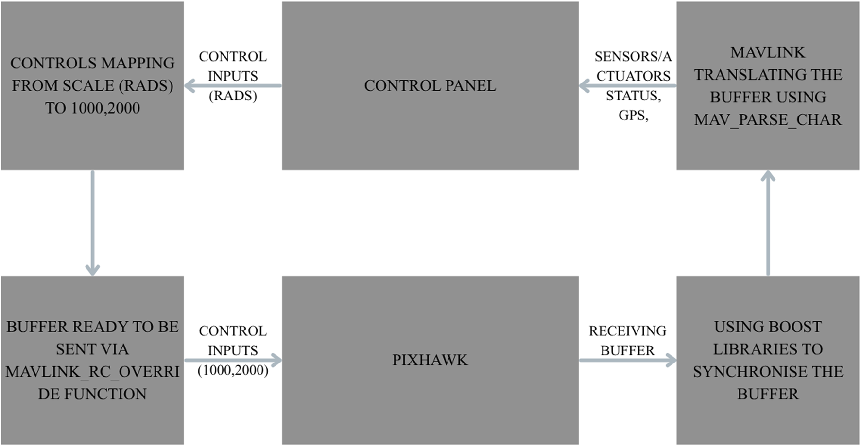 In order to receive information from the Pixhawk, such as sensor and servo status, either via USB or telemetry, a translation of the buffer is required. This information is stored in an array and parsed in a loop twice the size of the received buffer to avoid noisy data. However, it is not recommended to use loops in communication bridges; the maximum buffer size (MAVLINK_MAX_PACKET_LEN) is limited to a few bytes, so it will not create delays when sending and receiving messages. The maximum MAVLink message length can be 280 bytes, so our loop will execute for 280 iterations. This method of parsing the MAVLink buffer is taken from MAVROS, which executes a loop on the received buffer up to the size of the received bytes.
