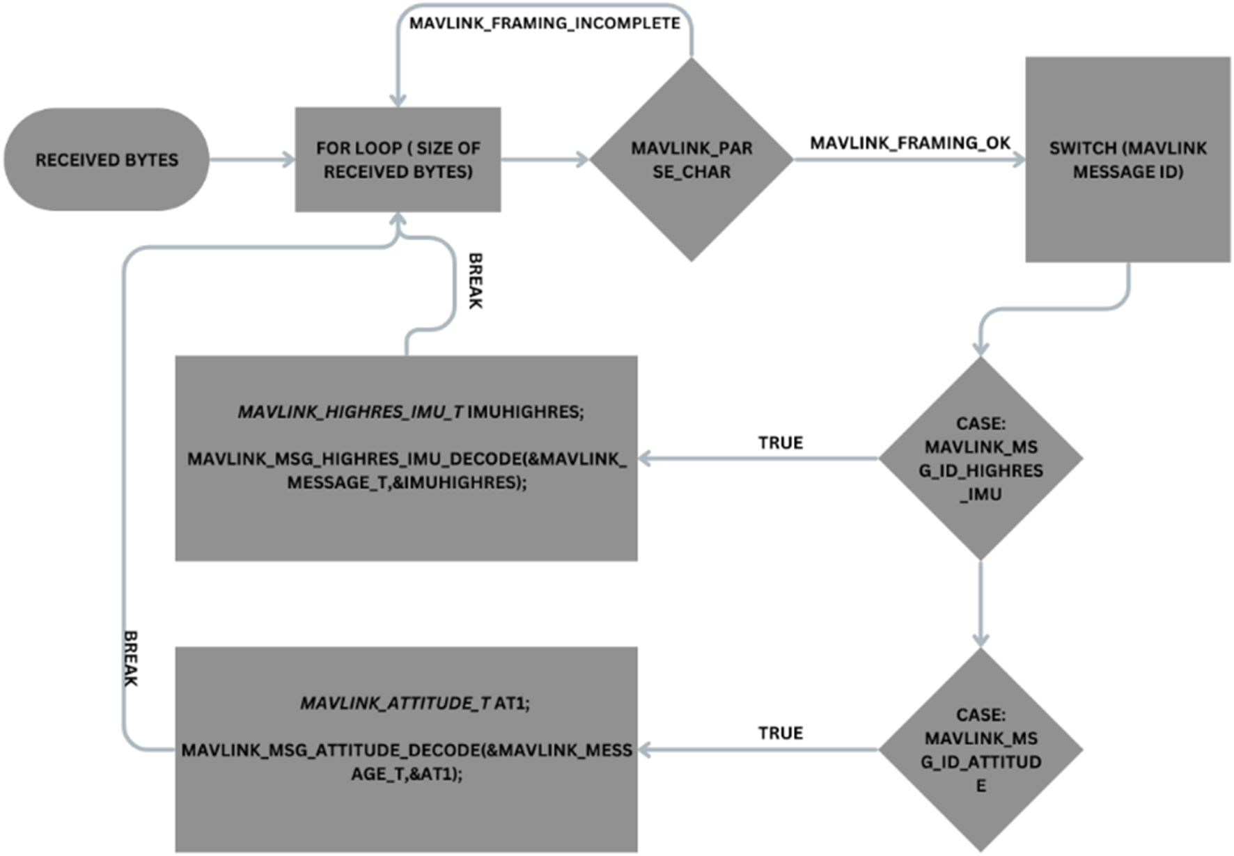 On returning the MAVLINK_FRAMING_OK, a switch condition is implemented for each message ID, which is then used as a case to decode a variety of MAVLink messages. These cases take the form of message IDs (from 0 to 255). For example, to decode a packet containing a raw IMU sensor message, the message ID is 27 or MAVLINK_MSG_ID_HIGHRES_IMU. Figure 5 shows how the process works for parsing and decoding the MAVLink messages when bytes are received via the serial channel.
