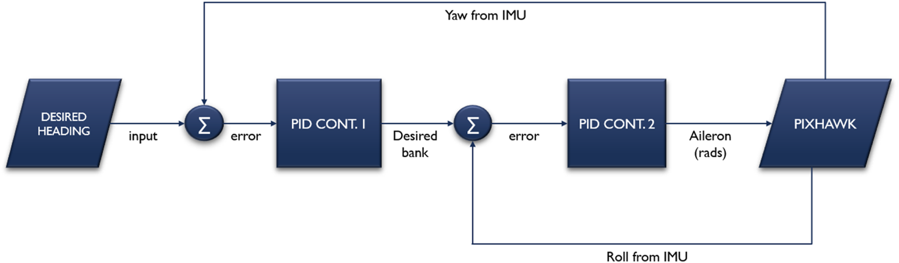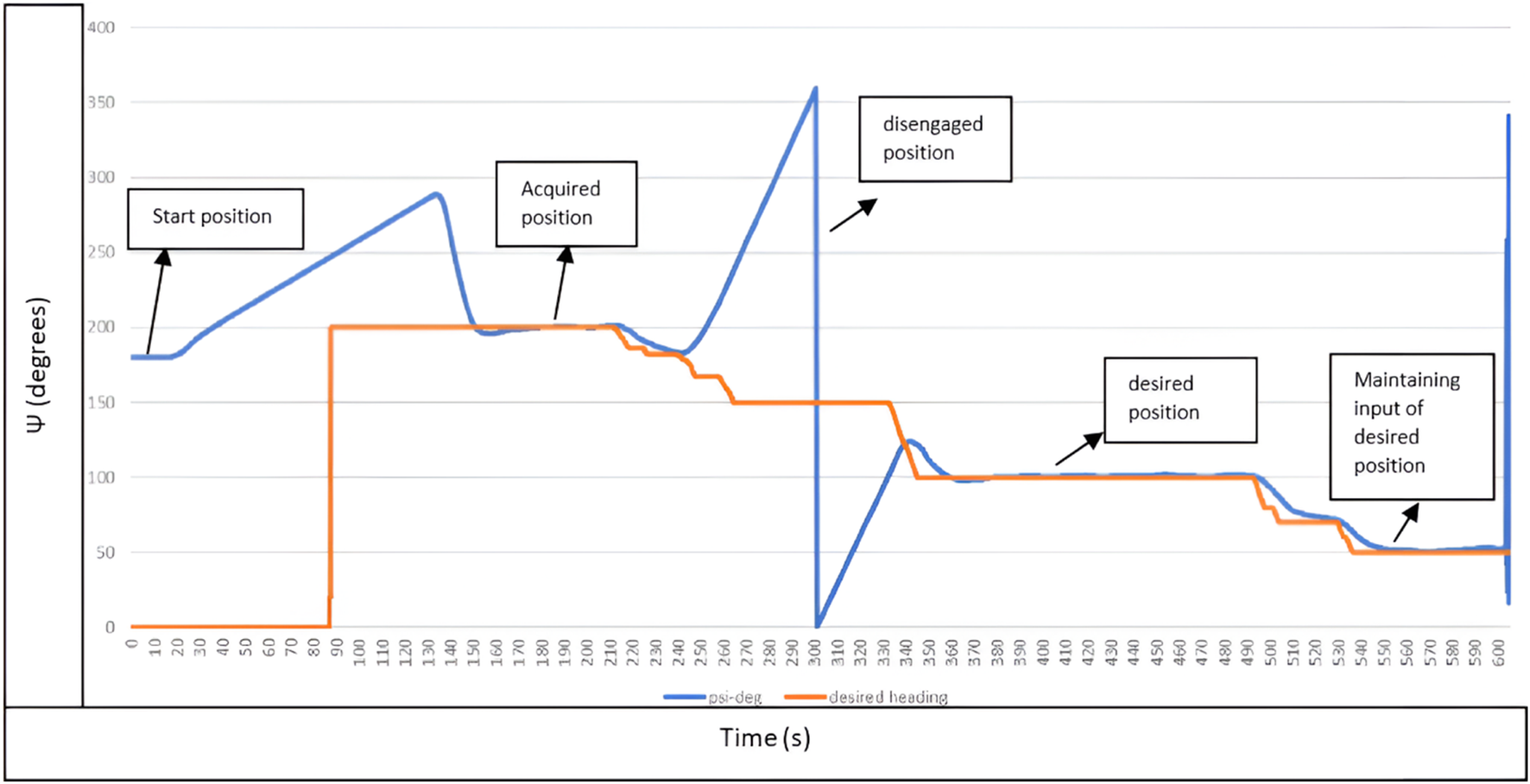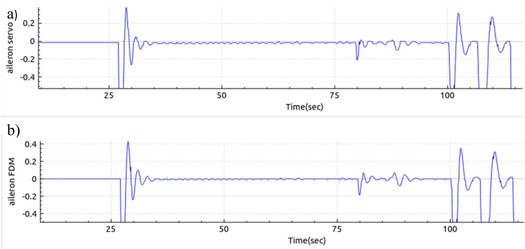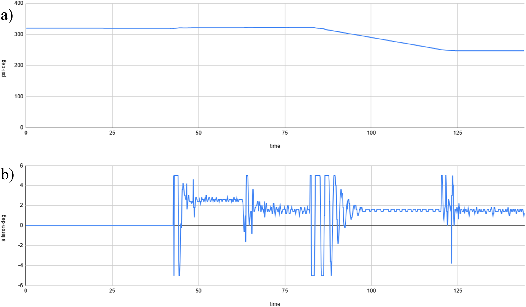 Figure 11 shows the control response of the aileron input after a 0.002% noise induction. The PID heading control is able to correct the aircraft heading without further need for tuning in case of sensor noise, but causes a continuous higher degree of actuation, which can result in more power consumption. Further tuning or the application of a Kalman filter could address this continuous actuation, but this is beyond the scope of this research.