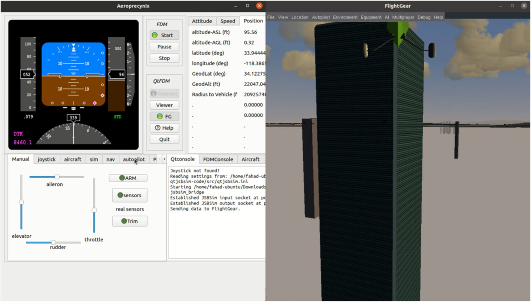 In recent years, flight and autopilot testing algorithms have improved significantly with the advent of modern tools such as MATLAB [1], with which a Flight Dynamics Model (FDM) can be designed for a specific aircraft. There are several other simulation platforms, such as the Robot Operating System (ROS), Microsoft Flight Simulator, and Simulink toolboxes, for crafting FDMs. ROS and MATLAB have long been used professionally as a means of providing high-fidelity simulations in the field of robotics and aviation because they have extensive modelling tools and libraries available, and their ability to design Graphical User Interfaces (GUIs) makes these two frameworks an equitable choice for aircraft simulations. MATLAB can also be equipped with an open-source flight visualisation tool, i.e., FlightGear, via a Universal Data Protocol (UDP) connection, eliminating the need to build a separate Graphical User Interface (GUI) [1]. Recently, MAVLink was added to MATLAB as part of the Unmanned Aerial Vehicle (UAV) toolbox to aid in communication with MAVLink-based flight controllers. Similarly, MAVROS, a package provided in ROS, is a communication driver for messages between ROS nodes and PX4. It is also capable of message forwarding, which is used when a flight controller is connected to a companion board or to communicate with other flight controllers in a swarm-based application. However, MATLAB/Simulink suffers from poor performance and requires high computational power to visualise effective results.