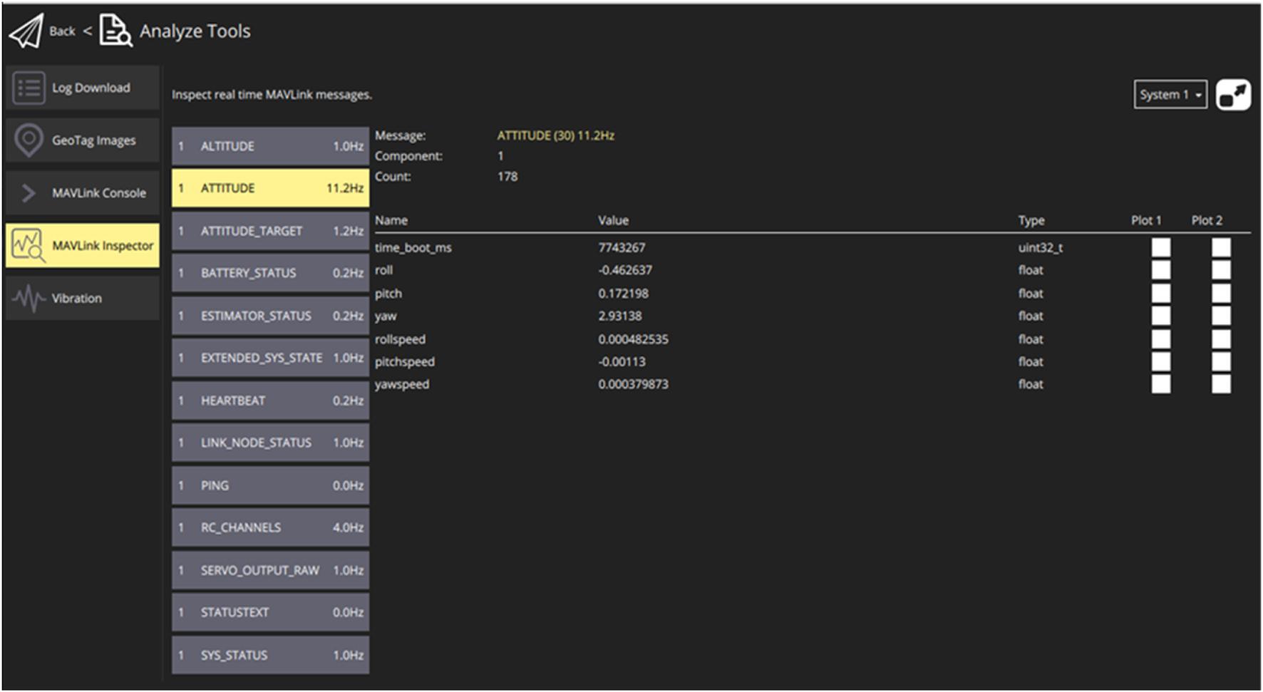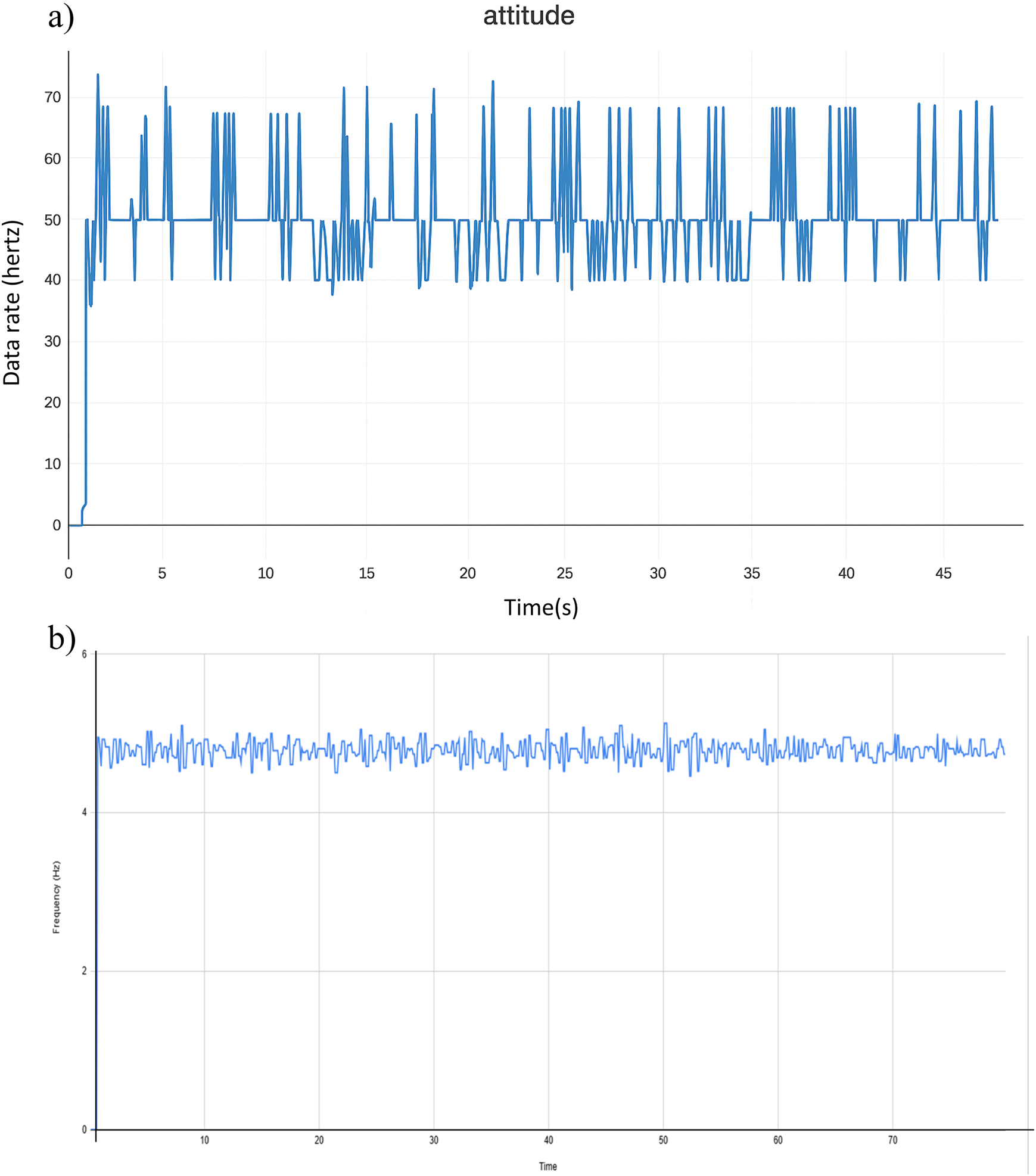 QGC is a well-established mission planner for Pixhawk-based vehicles and can be used as a means of comparison with our control station. Figure 12a shows that the AeroQT application can translate MAVLink messages at the same constant rate of 50 Hz as QGC via USB serial, as demonstrated by the altitude message incoming from Pixhawk.