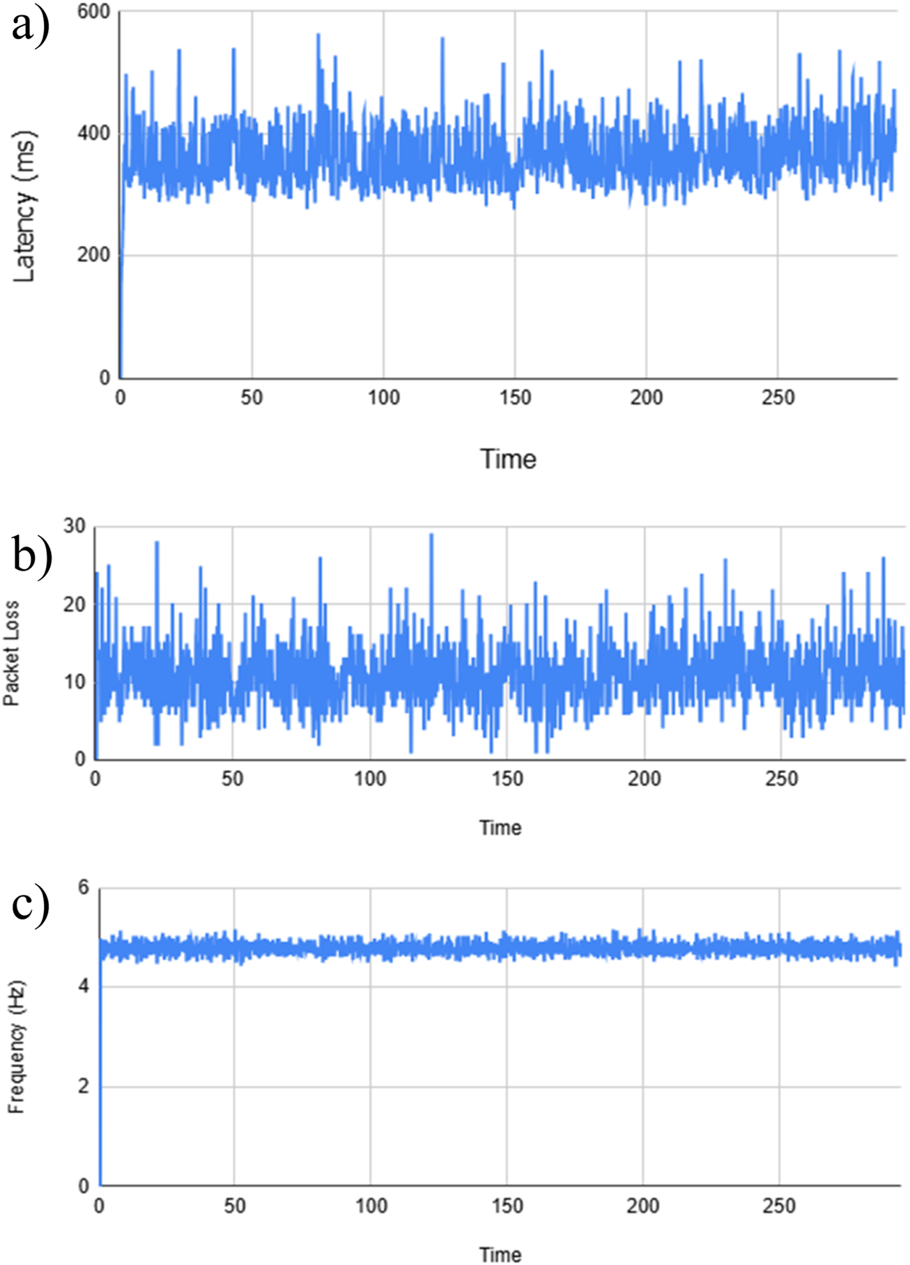 (a) Latency, (b) Packet Loss and (c) Frequency plot while connected via radio telemetry.