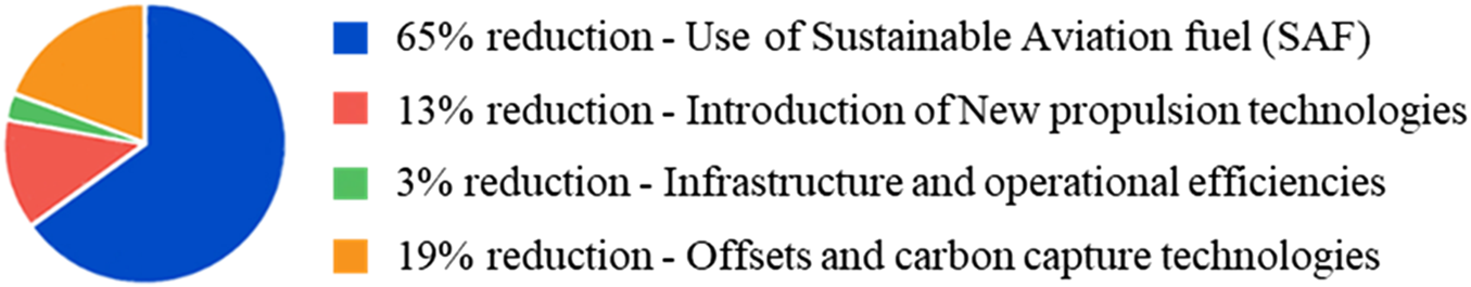 The quest to lower the emissions coming from the aviation industry has led to various emission reduction plans and climate roadmaps. Such roadmaps include the European Green Deal, which seeks to achieve carbon neutrality by 2050. This goal covers the vision to lower transport emissions up to 90% in comparison to 1990 with an intermediate GHG emissions reduction target of at least 55% by 2030 [1]. Another such roadmap specifically for the aviation industry is the International Air Transport Association (IATA) Fly Net Zero Plan, which came with a commitment by IATA member airlines to achieve net-zero carbon emission operations by 2050. The IATA strategy roadmap seeks to achieve net-zero through various emission reduction pathways, as shown in Figure 1 [4]: