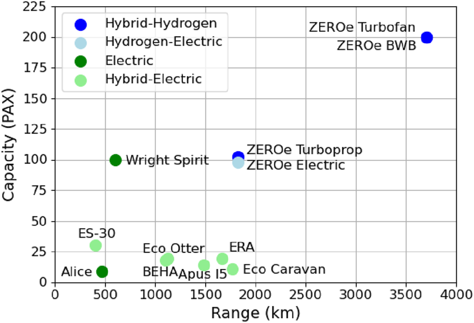 Market analysis of aircraft with new propulsion technologies compraring Range (km) and Capacity (Pax).
