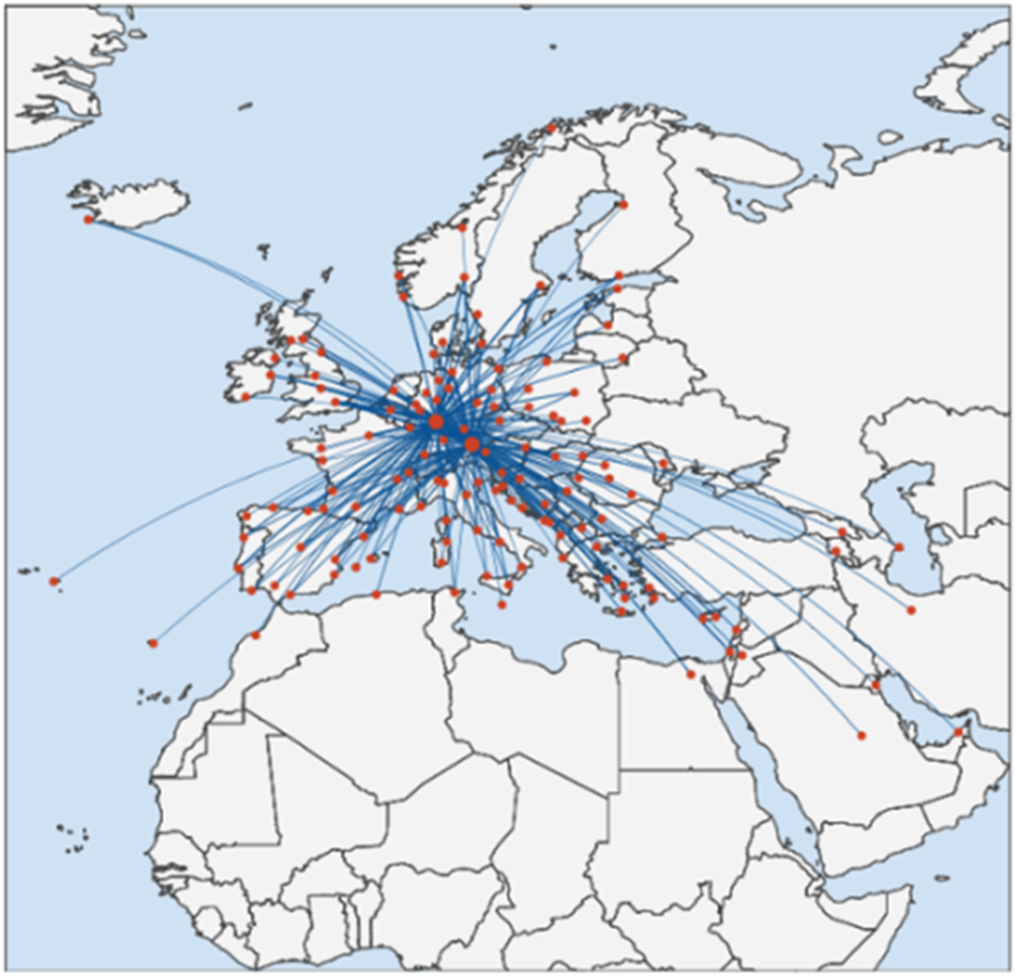 Now that the aircraft are selected, the current route network can be evaluated to identify possible routes for these aircraft. Hence, a list of all current routes as a first output can be drawn. This list includes the main characteristics of each route such as the distance between the origin and destination or the actual customer demand in a specific period to be considered. The required data for such a list has been collected manually by deriving all available flights from the airline in an exemplary week in June 2024. Therefore, Flight Connections [36] was used to identify all airline destinations that week and further the number of flights to each destination and aircraft type used for each flight. The choice of this monthly data does not yet account for seasonal variability, which does influence airline schedules. However, the goal of this study is with emphasis on range dependent feasibility which can be adapted to any other seasonal schedule. To determine the demand, it was assumed that the used aircraft was chosen to match the market demand well and that there is no undersupply of flights. Hence, the demand was determined by deriving the seats for each aircraft from the airline’s website. The sum of seats on each aircraft used on that route then represents the expected current demand. This research leads to the network shown in Figure 3.