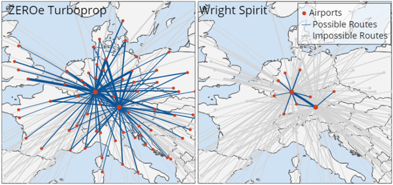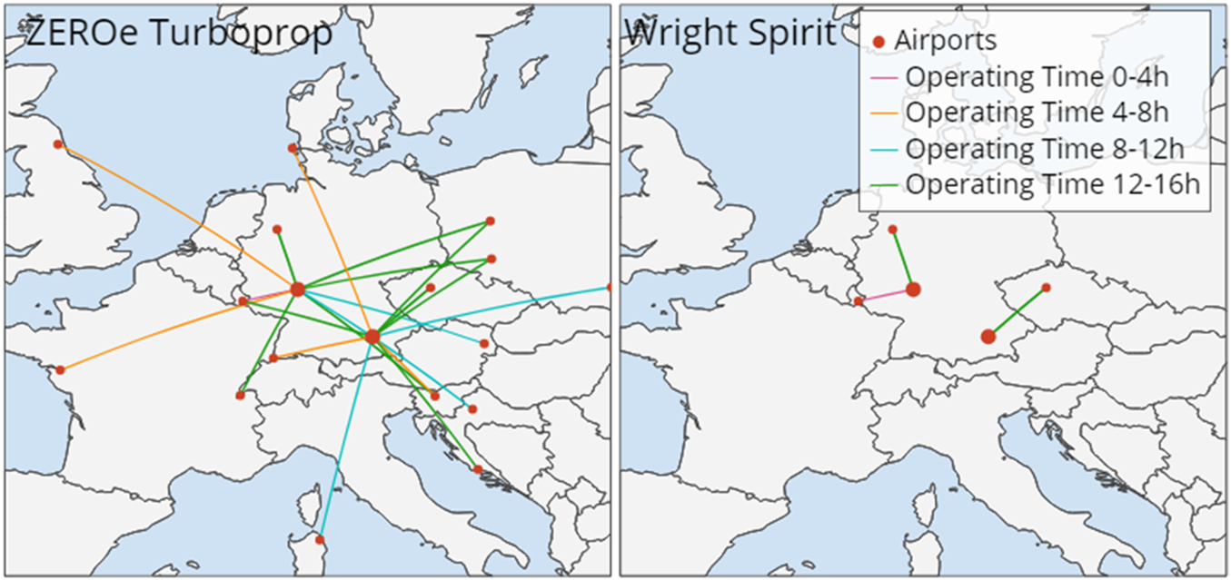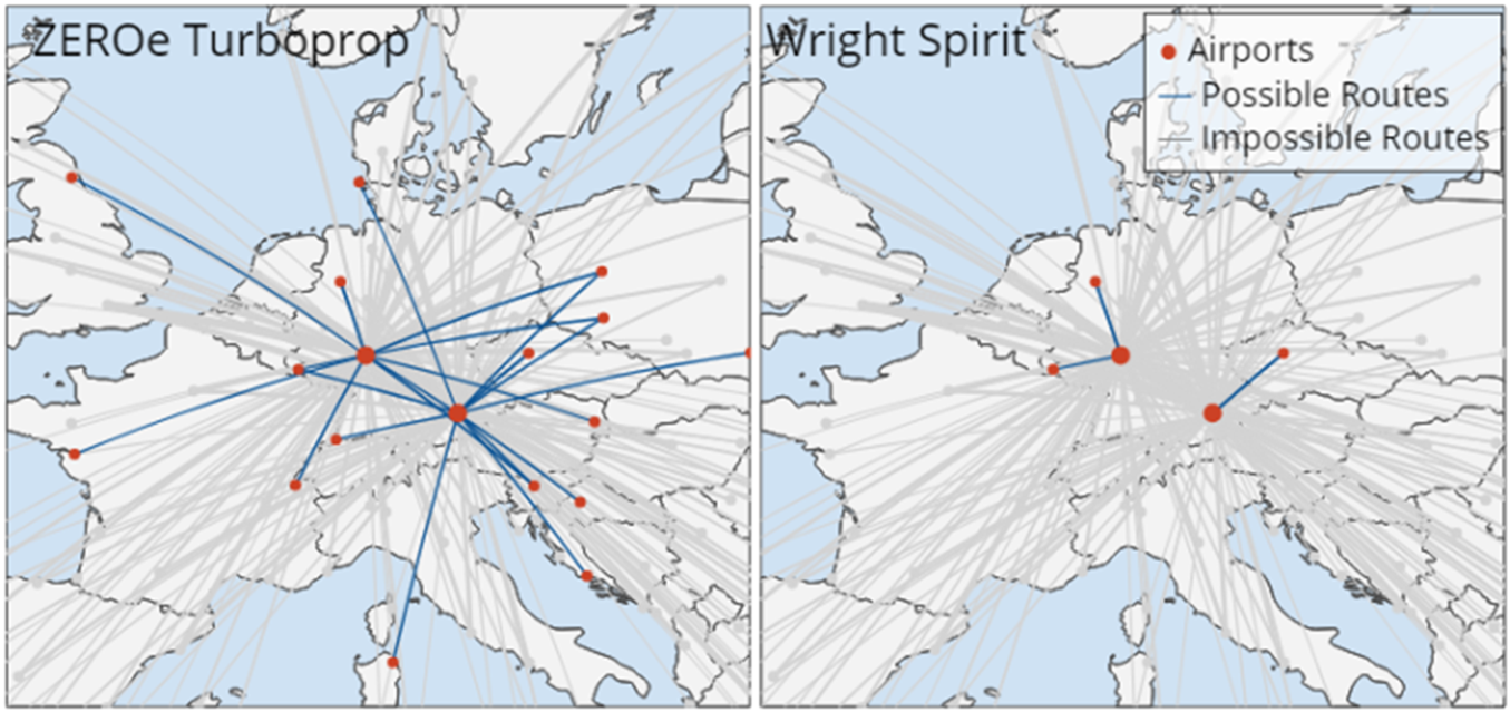 For our study, we identified a few of the new propulsion concepts within very close proximity to existing conventional aircraft. We have selected the Airbus zeroe turboprop and the wright spirit aircrafts with characteristics reflected in Table 1. We model the selected aircraft on the current network, to assess their operational impact.