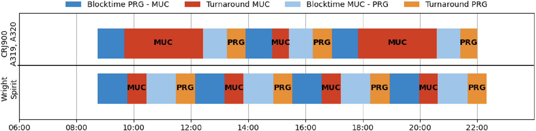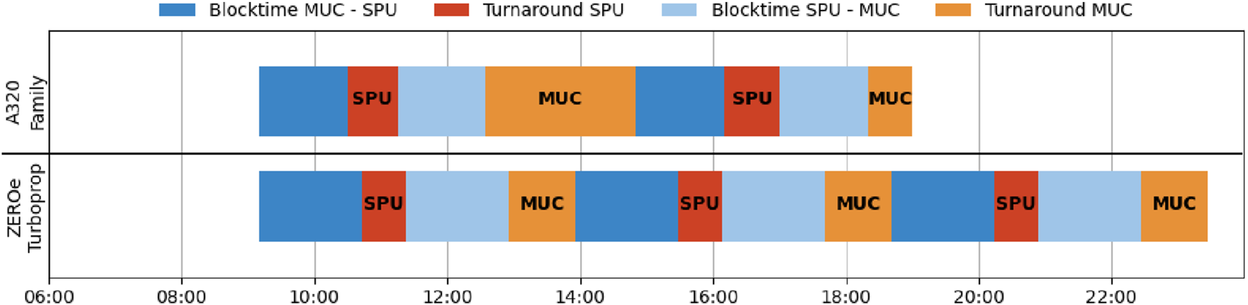 If the airline now wants to build a network Flight plan using the new aircraft, it can be done as usual by arranging the required number of flights per day with their calculated block and turnaround times. Additionally, information on the demand over the day is required to find an efficient schedule. For our scenario, the routes with the highest OT for each aircraft will be used. This leads to the route Munich-Split (MUC-SPU) for the Airbus ZEROe Turboprop and Munich-Prague (MUC-PRG) for the Wright Spirit. The matching of the demand is then carried out by comparing the new network Flight plan to the current schedule.