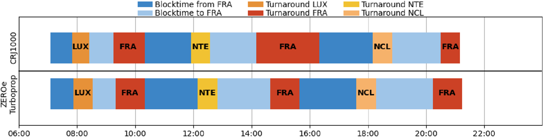 Both route Flight plan are already quite close to the current ones. However, due to the additional flights needed to cover the passenger demand, it cannot be fully ensured that the demand at a specific time of the day can be met. Hence another integration strategy can be interesting to solve this issue: operating multiple routes. This is a well-established scenario in the analyzed airline network to increase aircraft utilization and efficiency. To showcase an example closer to actual operations, the operation of a new aircraft on multiple routes has been considered. An exemplary Route network Flight plan was generated using the Airbus ZEROe Turboprop on the routes from Frankfurt (FRA) to Luxembourg City (LUX), Nantes (NTE) and Newcastle (NCL). Therefore, both operating times and locations had to match. The operating time of these three connections sums up 14.2 h, which is still feasible and as all return to the same hub, they are connectable. The updated Route network Flight plan is given in Figure 9.