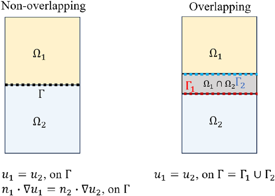 In the non-overlapping domain decomposition approach, the entire domain is divided into several subdomains (For example, and in Figure 2), and denotes the interface that separates the subdomains. The coupling conditions in the non-overlapping domain decomposition approach are expressed as shown in Equation 3:where and are from the numerical solvers at and , respectively. The first term is to impose continuity of at , and the second term represents continuity of the normal flux at the interface.
