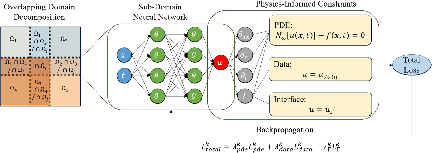 For each subdomain, a physics-informed neural network (PINN) is assigned as shown in Figure 3. For the subdomain , the total loss consists of the PDE loss , data loss , and interfacial loss , each with their corresponding weights , , and , as defined below:where is the prediction at the interface from the PINN model in the adjacent subdomain. For the forward problem, is the initial/boundary conditions in the subdomain. For the inverse problem, are the measurements on in the subdomain. , and are the number of sample points for their corresponding loss terms. In the present work, we used the same number of PINN models as the number of subdomains, and the PINN model in each subdomain was trained in parallel on different devices using its own loss, i.e., .