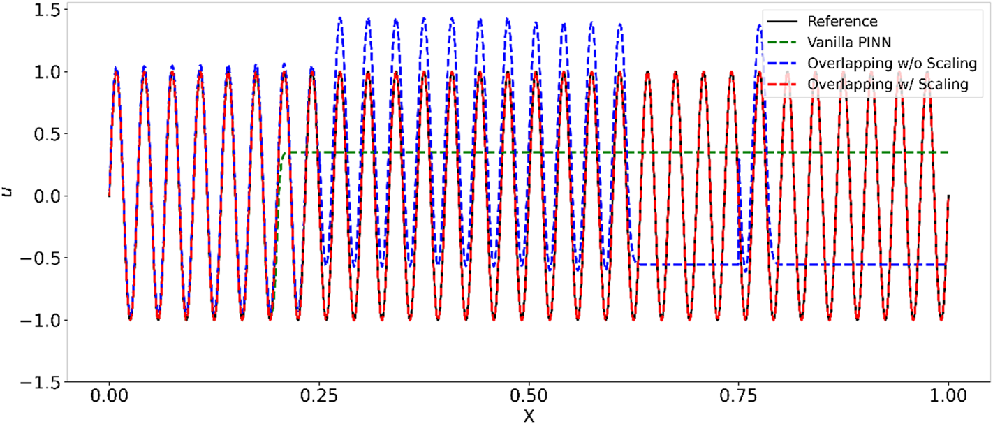 Furthermore, we applied the following rescaling technique to the PINN input in each subdomain as shown in Equation 5:where and can be obtained as we know the boundaries of each subdomain. In this way, the input for PINNs in each subdomain will be rescaled to the range of −1 to 1. For problems with high-frequency solutions, this rescaling will decrease the frequency in each subdomain, and thus migrates the issue of spectral bias in vanilla PINNs.