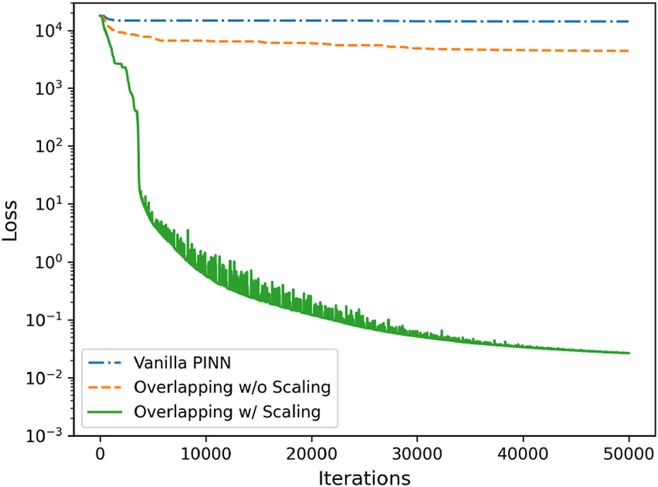 Finally, the loss history of the vanilla PINNs and the overlapping PINNs with and without rescaling is shown in Figure 5. As can be seen the loss for the overlapping PINNs with rescaling decreased the fastest among the three models. In addition, the loss for the overlapping PINNs with rescaling at 20,000 training steps was approximately four orders smaller than the other two models, which is consistent with the results in Figure 5.