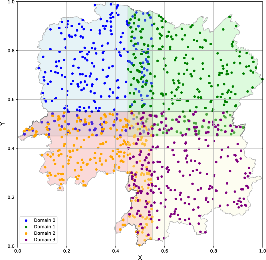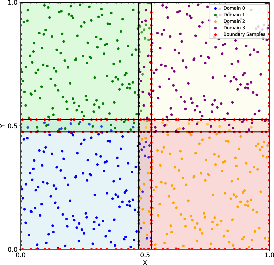 Similarly, we divided the entire domain into four subdomains, as shown in Figure 6. The locations for the interfaces that divide the computational domain into four subdomains in the and directions are and , respectively. The details for the overlapping PINN model are listed in Supplementary Table SA1.