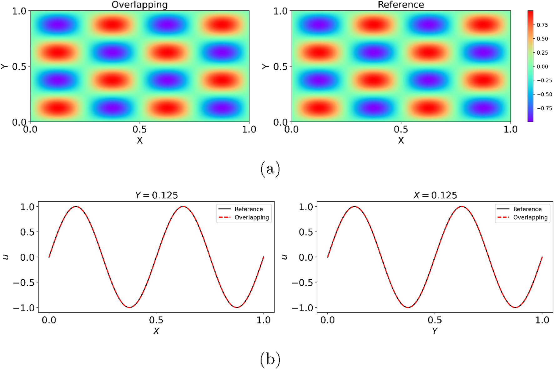 The results from the overlapping PINNs with four subdomains are shown in Figure 7. It is observed that: (1) the periodic pattern of the solution was well captured by the proposed model (Figure 7a); and (2) the predictions of at two representative locations, i.e., and agreed well with the reference solution as in Figure 7b. In addition, we used the trained PINNs to predict at a uniform grid across the entire domain to estimate the relative errors. The relative error between the predictions from the overlapping PINNs and the reference solution was found to be , demonstrating the good accuracy of the present approach for cases with domain decomposition in the spatial domain.
