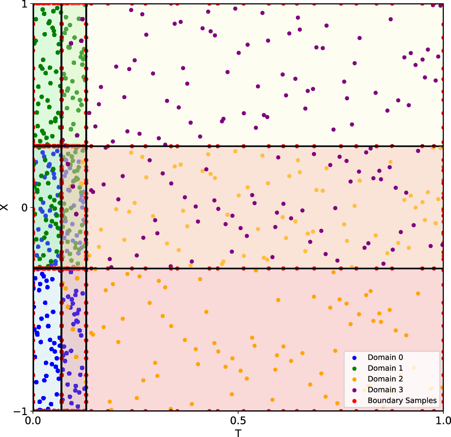 Similar to the test case in Section 2D Helmholtz Equation, we divided the entire spatial and temporal domain into four subdomains, as shown in Figure 8. In particular, to demonstrate the flexibility of domain decomposition in the present method, the locations of the interfaces that divide the entire domain into four subdomains in the and directions were calculated as and , respectively. The obtained four subdomains are of two different sizes in the spatial-temporal domains. Coupling conditions were imposed at the interfaces to ensure continuity of the solution. The points that were used to evaluate the losses of the PDE residue and the boundary/coupling conditions were randomly generated. More details are in Supplementary Appendix SA.