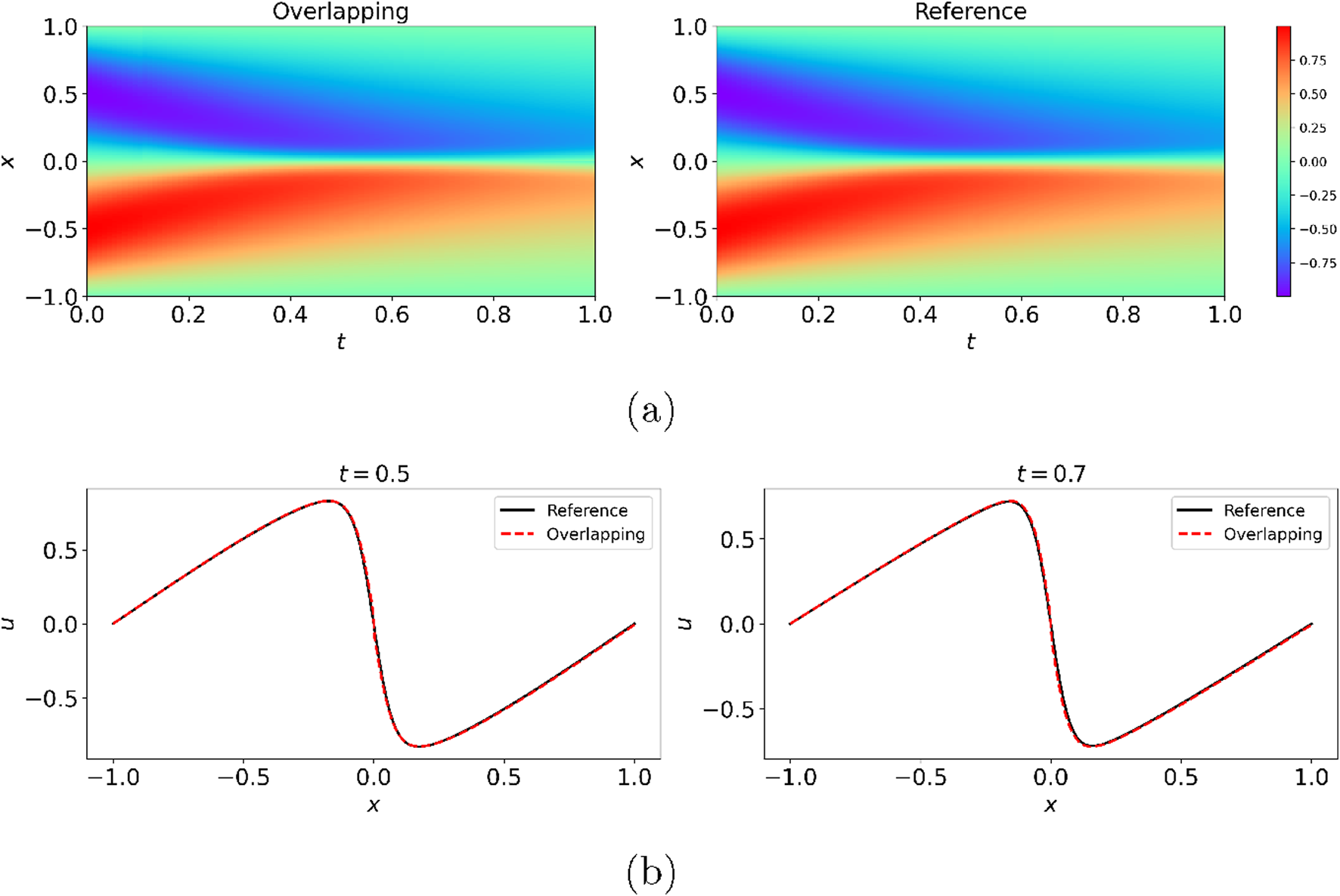 We then tested the spatial-temporal parallelism of the overlapping PINNs. The test case considered here is one of the most fundamental partial differential equations in fluid mechanics and nonlinear wave propagation, i.e., Burgers’ equation, which takes the following form as shown in Equation 12:where and are the spatial and temporal coordinates, respectively, is the solution to the equation, and the viscosity coefficient is set to be . The initial condition is given by Equation 13:and the Dirichlet boundary conditions are imposed on the boundaries as specified in Equation 14: