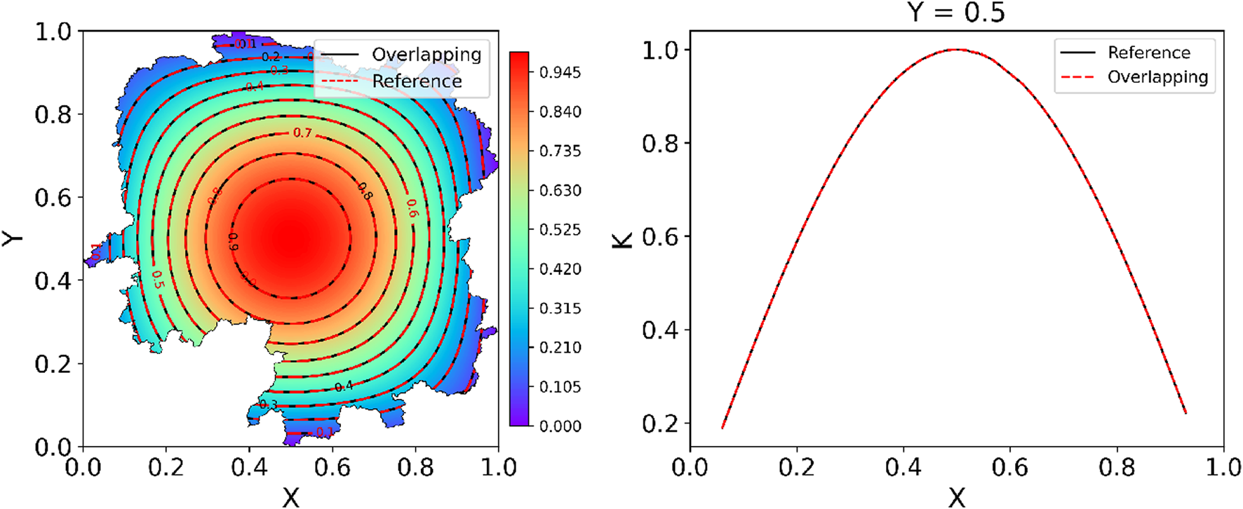 The interface conditions and sampling points were generated by the same method used in the Burgers’ equation. The predicted thermal conductivity of the overlapping PINNs is shown in Figure 11. Interestingly, the overlapping PINNs predicted the thermal conductivity well, consistent with the reference solution, even though the domain was irregular. We used 30,000 randomly sampled points in the entire domain to estimate the relative error, and the relative error was found to be 0.026% for the overlapping PINNs. The irregular domain did not impede the PINNs, as the predicted thermal conductivity on the irregular boundaries was smooth. This is an advantage of PINNs compared to the traditional finite element method (FEM), which needs special treatment of irregular computational domains.