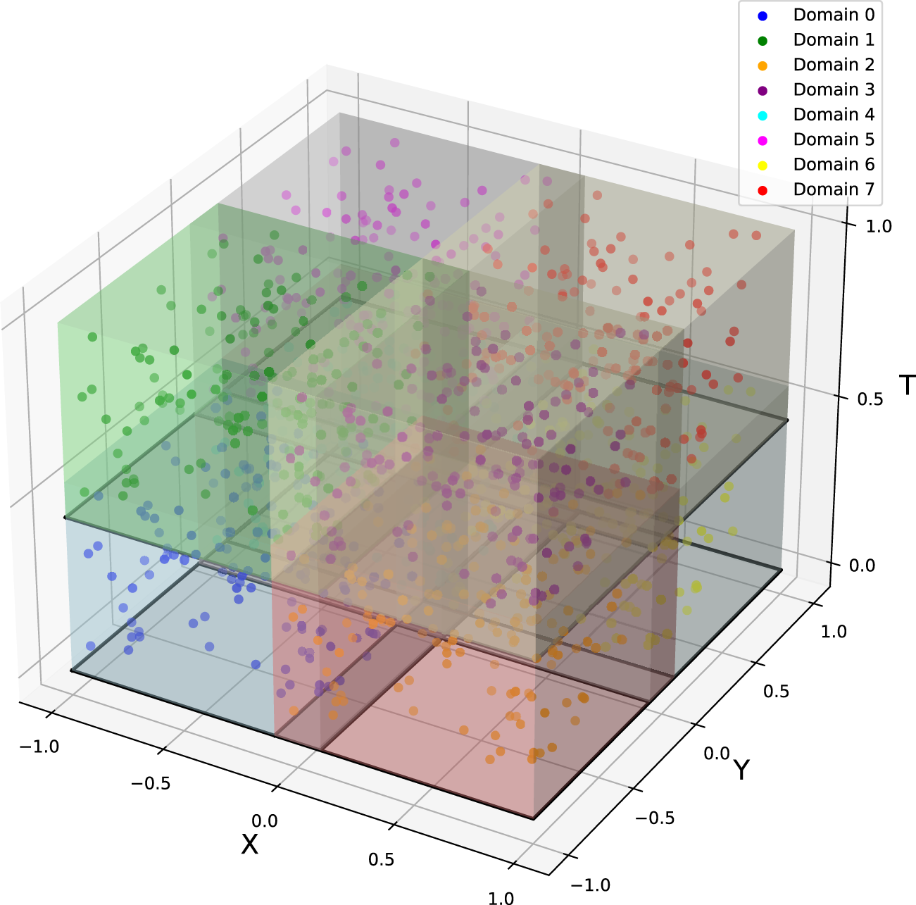 As in Section 2D Heat Conduction, assuming partial measurements of the temperature field are available, we aimed to infer the thermal conductivity using the overlapping PINNs. Specifically, we decomposed the entire spatial-temporal domain into eight subdomains, as illustrated in Figure 12. The locations of the interfaces that divide the entire domain into several subdomains in the , and directions were , and , respectively. All the points employed to compute the loss of the overlapping PINNs were generated via the Latin Hypercube sampling. Details can be found in Supplementary Appendix SA.