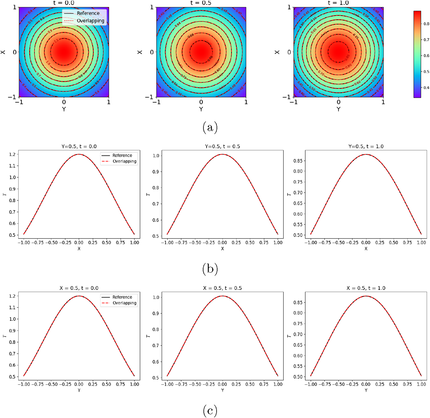 In this section, we present a series of numerical experiments on both forward and inverse PDE problems to demonstrate the accuracy of the overlapping PINNs. Furthermore, we test the speed-up ratio of the overlapping PINNs using an example of an inverse two-dimensional time-dependent heat transfer equation. All the training of PINN models was performed on NVIDIA RTX 3090 GPUs with implementations using the PyTorch 2.3 framework. Details on the computations, e.g., architectures of neural networks, optimisers, etc., for each test case are provided in Supplementary Appendix SA in addition to the first test case.