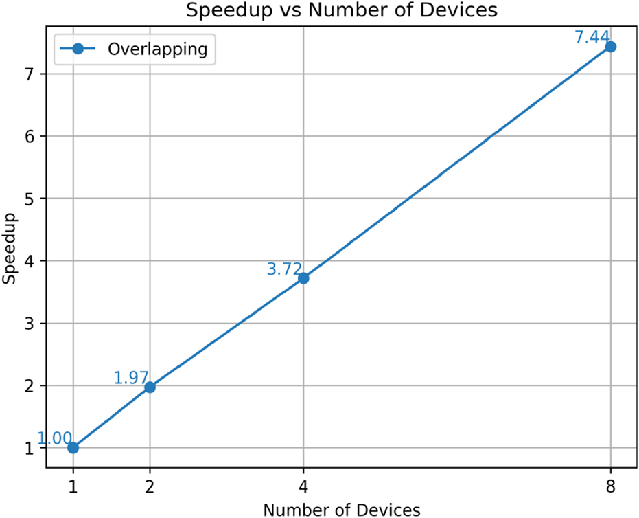 Furthermore, we tested the speed of the overlapping PINNs as we increased the number of subdomains/GPUs. The subdomain division was the same as mentioned above. For the single GPU test, all sample points in the subdomains were assigned to the single GPU. For multiple GPUs, the sample points in the subdomains were evenly assigned to multiple GPUs, meaning each GPU had the same number of sample points. The results of the speed-up ratio (defined as the ratio of the computing time of a single GPU to that of multiple GPUs) of the overlapping PINN are shown in Figure 14. As can be seen, the speed-up ratio increased almost linearly with the number of GPU devices. This demonstrates the effectiveness of parallel computing of the overlapping PINN based on GPUs. For example, when using 8 GPUs, we were able to achieve a speed-up ratio of 7.44, leading to approximately efficiency. The above results demonstrate that the spatial-temporal parallel overlapping PINNs are promising for solving large-scale problems.