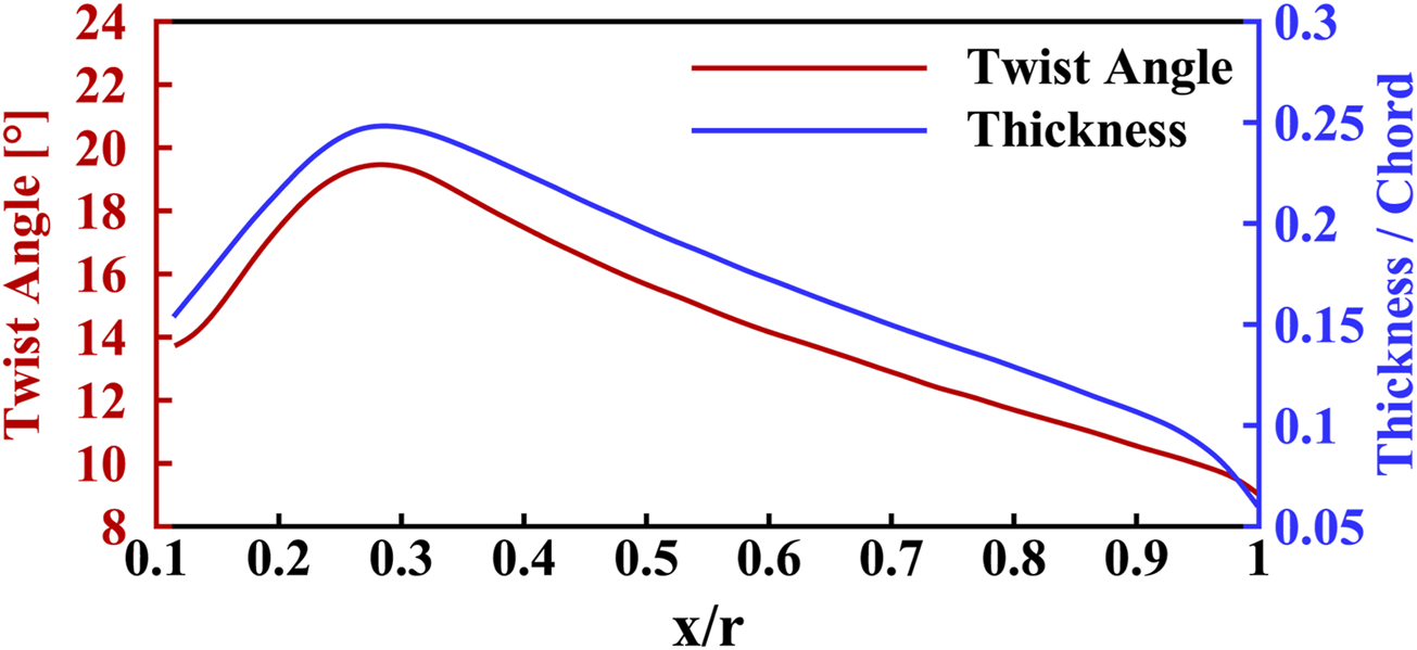 The geometry was constructed based on the two-bladed rotor of DJI-9450, of which the diameter is 0.24 m. The thickness and twist angle distribution of the blade along the radial direction is illustrated in Figure 2. Both parameters reach the maximum values near of the blade spanwise length. And the chord and thickness at the blade tip are much smaller than those at the blade root.