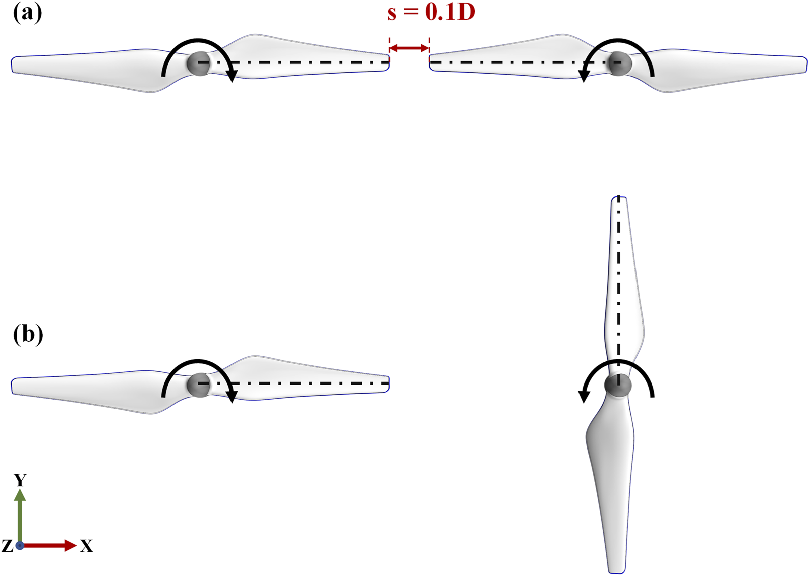 The dual-rotor systems with different initial phases, ° and °, are shown in Figure 3. Here in the case of 0°, the two rotors are aligned with the same phase angle, whereas 90° leads to the phase angles of the rotors being normal to each other. The distance between the rotors is 0.1D, where D is the rotor diameter. The hover condition, without the consideration of the forward flight speed, was simulated. A representative rotational speed of 5400 RPM was considered, corresponding to the BPF of 180 Hz.