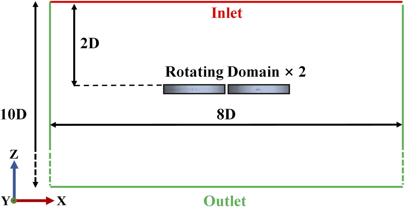 The computational domain was defined as a cylindrical volume enclosing the dual-rotor system, as shown in Figure 4. The origin of the global coordinate system is located in the middle of the gap between the rotors. The length scales labeled in the figure are normalized by the rotor diameter D. The diameter of the computational domain is 8, and it streamwise length is 10 with 2 upstream of the rotor plane and 8 downstream. A sliding mesh approach is employed to capture the rotor motion, wherein two rotating subdomains are defined to contain the rotors. Boundary conditions are specified as follows: the top boundary is prescribed as a pressure inlet, while the side and bottom boundaries are treated as pressure outlets. The rotor surfaces are set as no-slip walls.