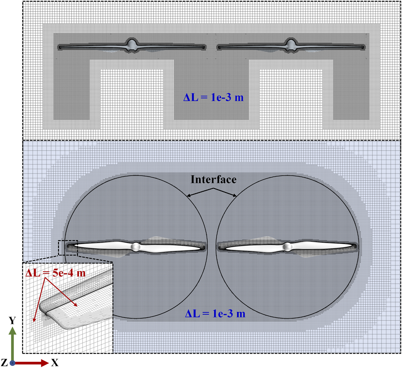 To ensure the numerical accuracy in resolving near-field flow structures and computing the far-field noise using the FW-H acoustic analogy, the computational meshes were refined in specific zones where flow vortices are intensive. Volume and surface cells in cut-planes and the walls are illustrated shown in Figure 5. A volume refinement zone with a base cell size of 5e-4 m was established within 4 mm offset from the rotor walls. Outside of this zone, a second-level refinement was set with a base cell size of 1e-3m. Near the leading edges, trailing edges and tips of the blades, the base grid size was set between 1.25e-4 mm and 2.5e-4 m. The first layer height of near-wall cells was 2e-6 m, and there are 25 prism layers with a growth ratio 1.2, forming a total thickness of 1e-3 m to resolve the boundary layers. The mesh contained 5.36 million cells in each rotating subdomain and 12.8 million cells in the outer stationary subdomain.