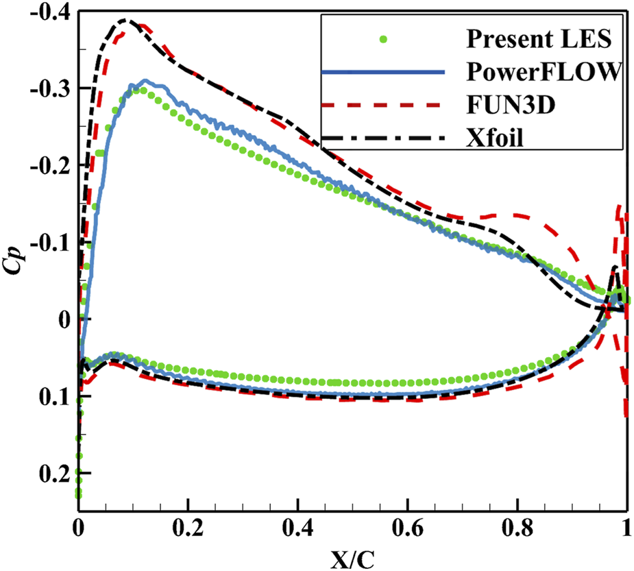 An isolated DJI-9450 rotor was studied as the reference for validation. The pressure coefficient distribution along the blade chord at the spanwise section of 0.5R is shown in Figure 6. The present results were compared to the simulation data from Christopher et al. [24] using PowerFLOW, which was programmed based on the lattice Boltzmann Method integrated with the Very Large Eddy Simulation (LBM-VLES), and also compared to the results using XFOIL (based on the potential flow theory) and FUN3D. It is observed that the present results align well with the high-fidelity LBM-VLES results, particularly in capturing critical flow characteristics such as the suction-side pressure peak and the leading-edge pressure gradient. This confirms the accuracy of the present numerical method.