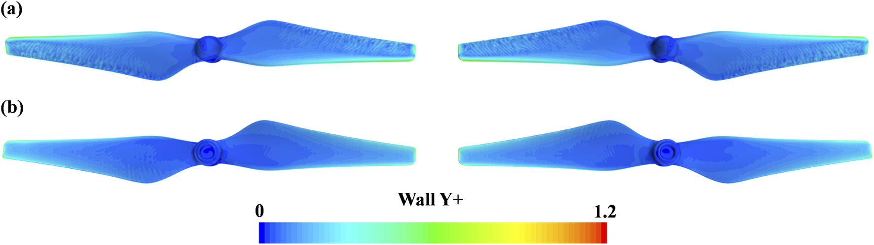 To further demonstrate the rationality of the computational setup, Figure 7 illustrates the y+ distribution on the dual-rotor surfaces. Given that the y+ values are generally small and remain below 5, the use of a low Reynolds number wall treatment would also be reasonable. However, due to the geometric complexity of the rotors, localized regions with relatively coarse mesh resolution may occur especially near intricate corners. These areas are often difficult to identify and correct thoroughly. Therefore, we adopted an all-y+ wall treatment to avoid potential inaccuracies that might be overlooked. This method automatically switches to a low Reynolds number mode in regions with sufficiently refined near-wall grids, achieving consistent behavior with a dedicated low-y+ treatment while ensuring robustness across the entire computational domain.
