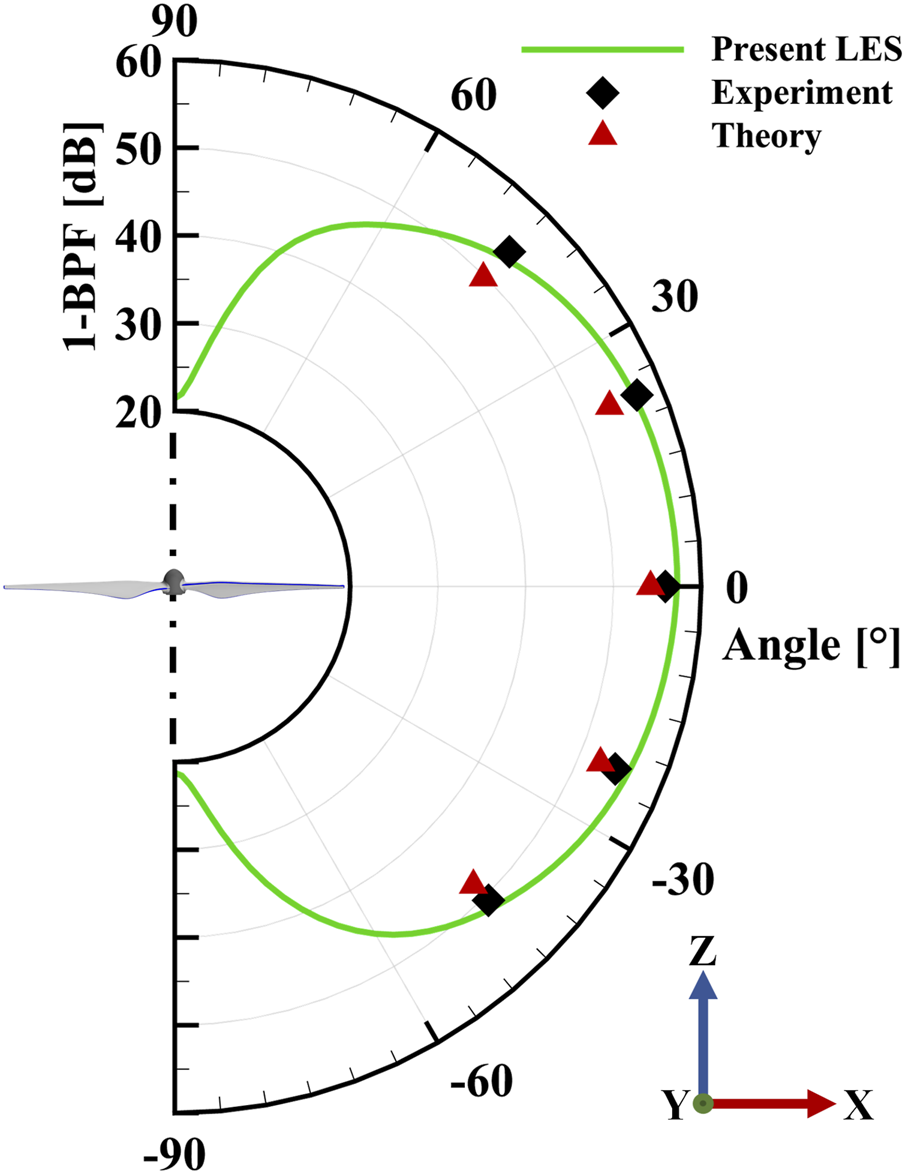 The experimental data was from the measurements of an isolated DJI-9450 rotor by Zhou et al. [15]. The directivity of the noise at the first BPF, which is 180 Hz, was measured at five microphones that are positioned in a circle spanning from −45° to 45° with 1.2 m (i.e., 5 times the rotor diameter) away from the rotor. As shown in Figure 8, the present LES results for the first-BPF directivity agree with the experimental data, while showing discrepancies by approximately 1 dB as compared to the theoretical model in Equation 1. Thereby, the validity of the present simulation method is demonstrated.