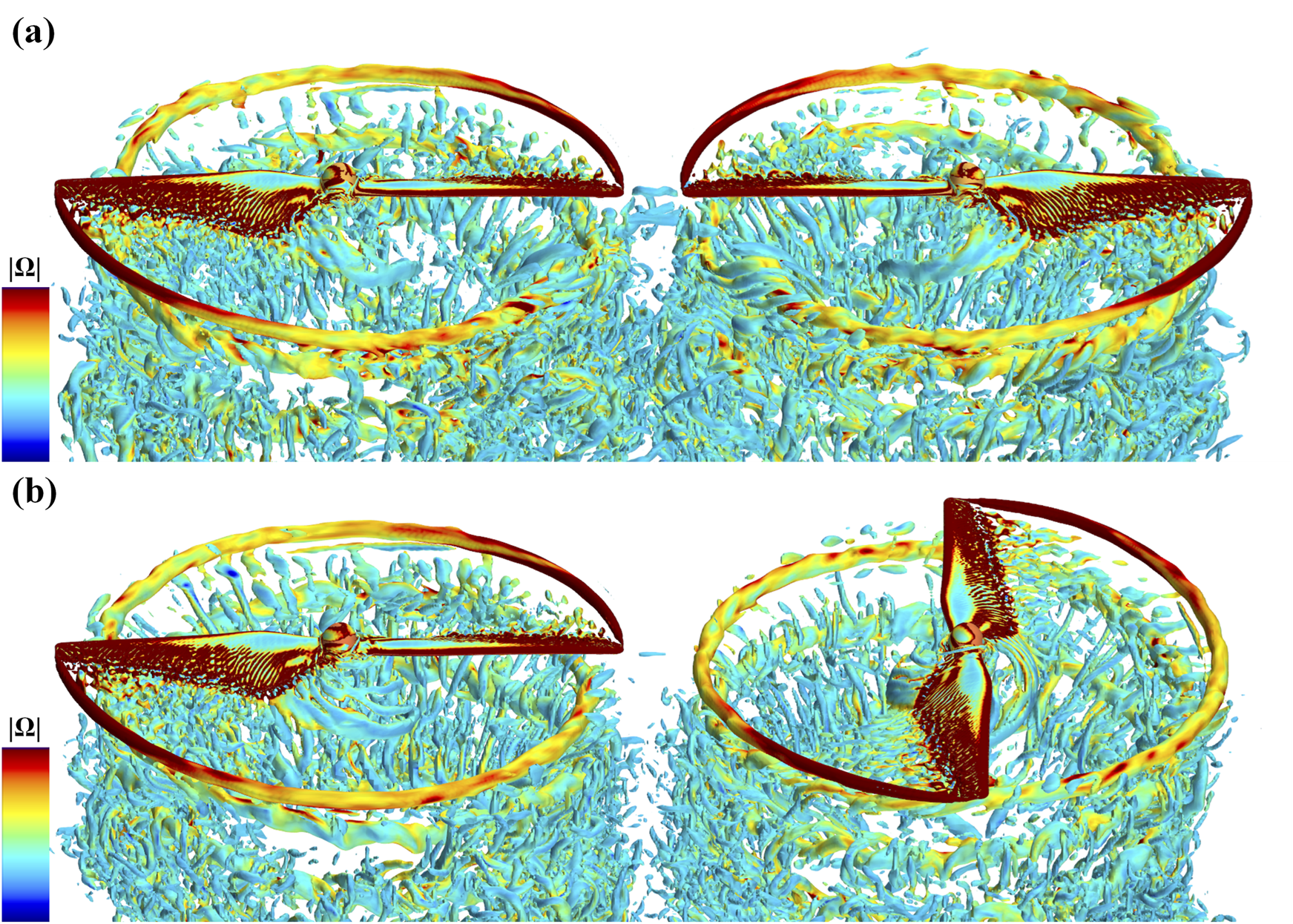 Figure 9 presents vortex isosurfaces, defined by the Q-criterion, for the two dual-rotor systems. In the case without a phase difference (°), the wakes from the rotors interact with each other in the middle position between them. This interaction is directly related to the phase change, so that the most intensified interaction happens when the blade tips have the shortest distance. In contrast, the case with ° shows less interaction of tip vortices in the region between the rotors.