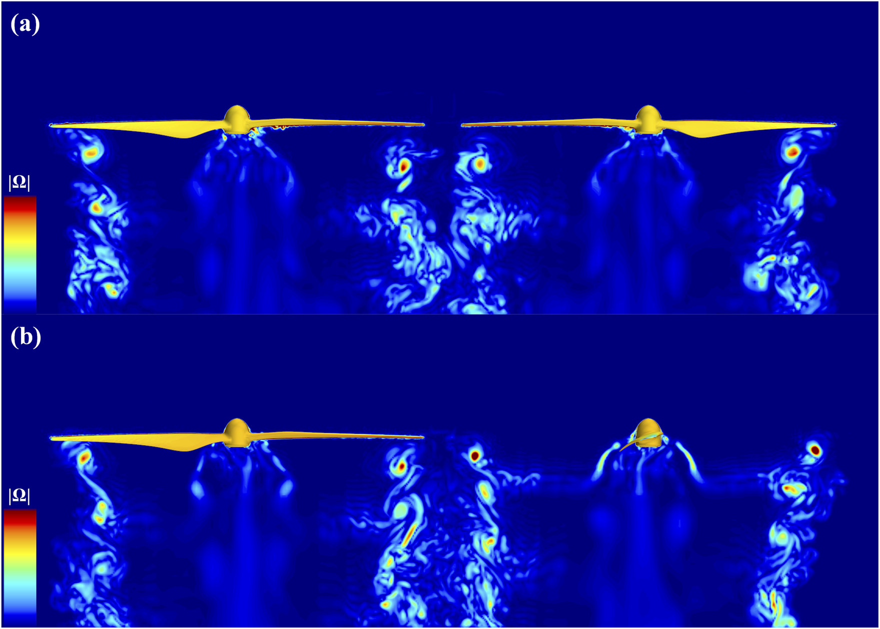 Vorticity magnitudes of the two dual-rotor systems are shown in Figure 10. In the case without a phase difference, tip vortices in the wake become unstable and dissipate rapidly. This might lead to the unsteady loads acting on the rotor tip and, consequently, increase the noise generation. In the case with the 90° phase offset, vortices in the zone between the rotors are relatively less turbulent, and tip vortices maintain their coherent patterns. This suggests that the wake interaction is weaker as compared to the other case.