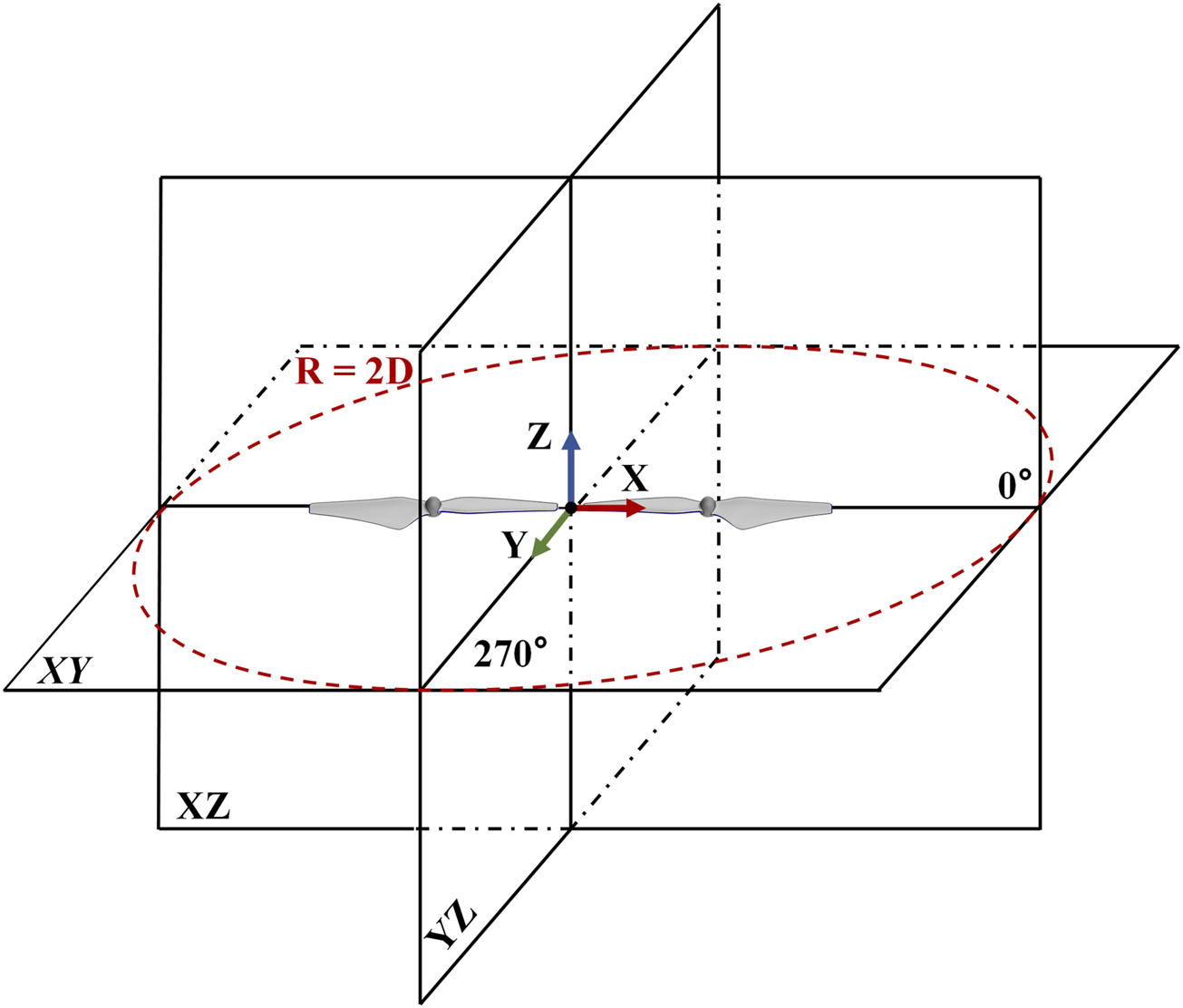 The microphone positions for collecting acoustic pressure are illustrated in Figure 11. The microphones were set up along a circle with a radius of 2 times the rotor diameter. The circle center was positioned at the origin of the global coordinate system, which is in the middle of the gap between the two rotors. The circle is in the XY plane, in which the rotation centers of the rotors are located.