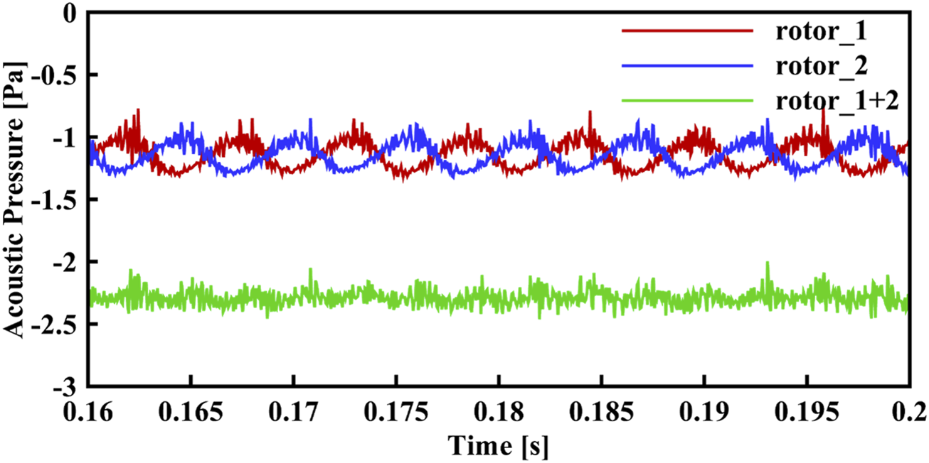 Time history of acoustic pressure at the microphone of ° in the dual-rotor case of °.